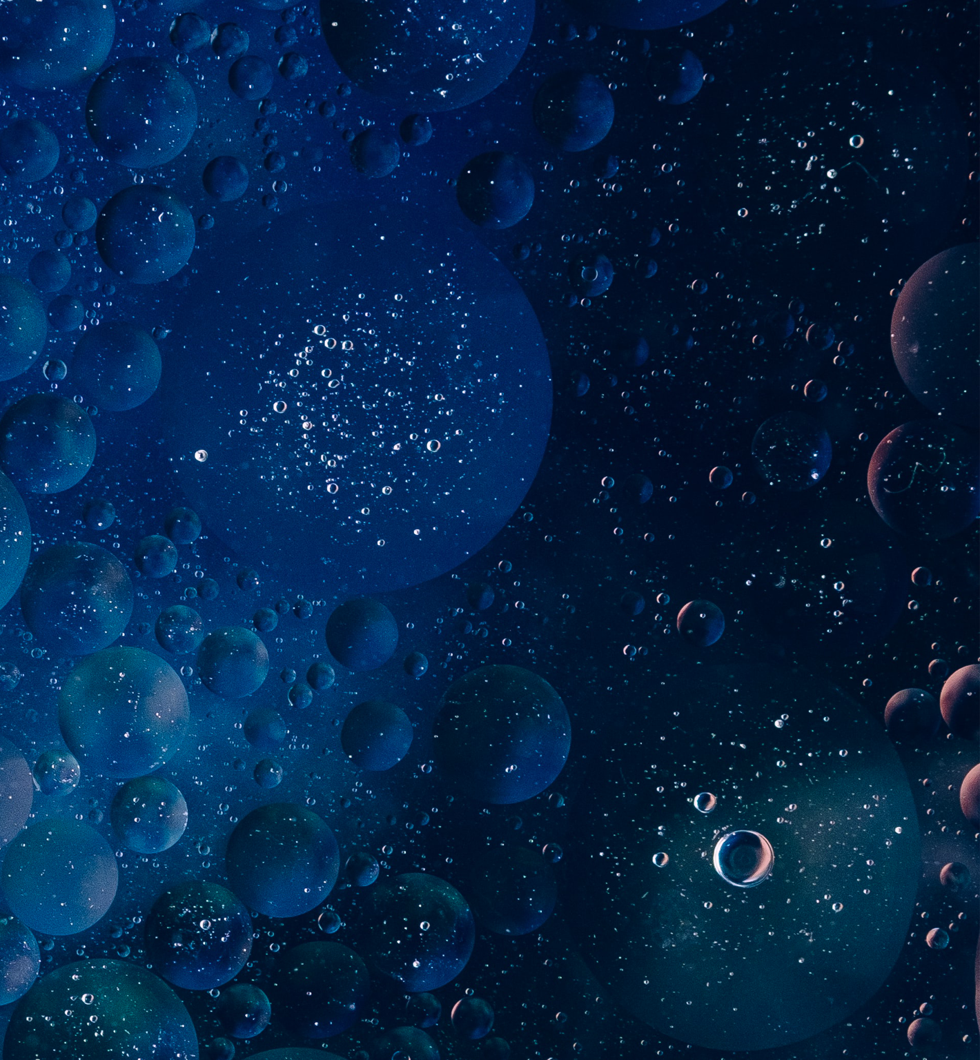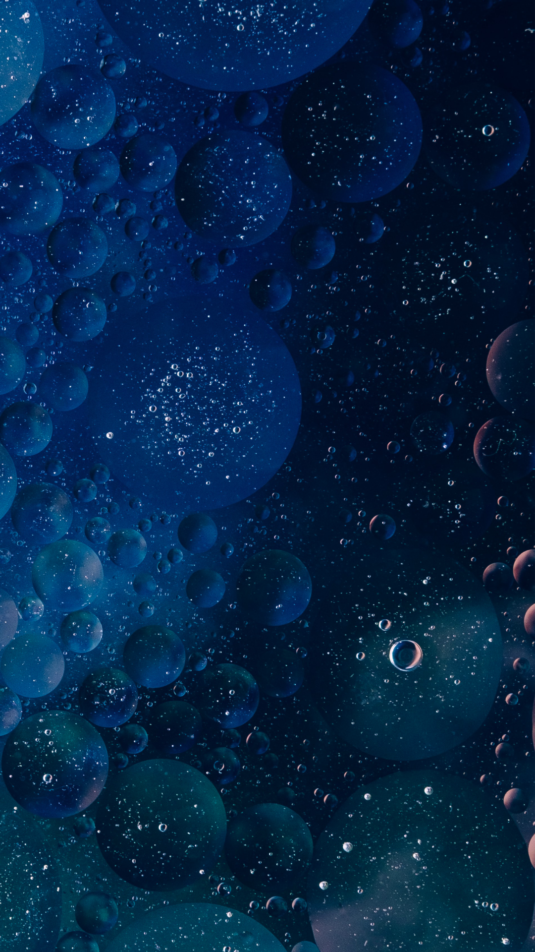 Close-up of overlapping spherical bubbles fills the vertical frame. Dark teal and navy hues create a somber, blurred depth.