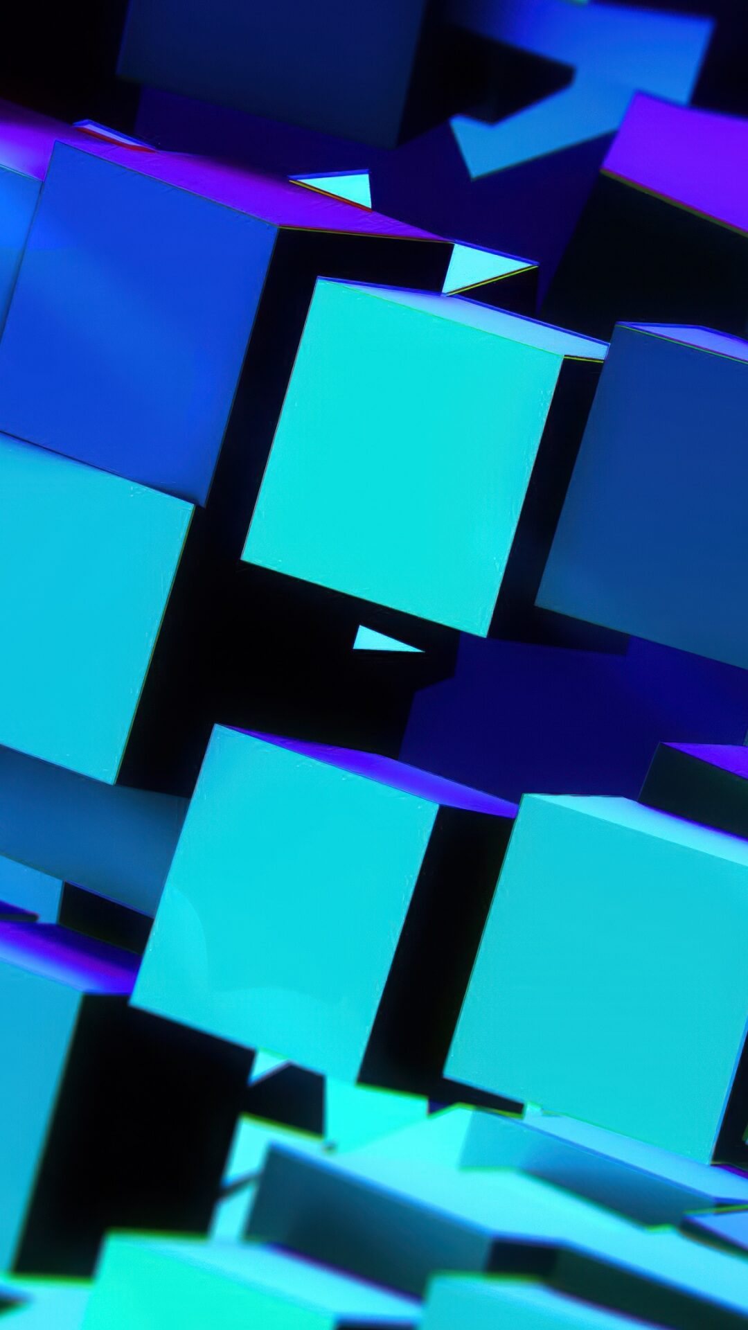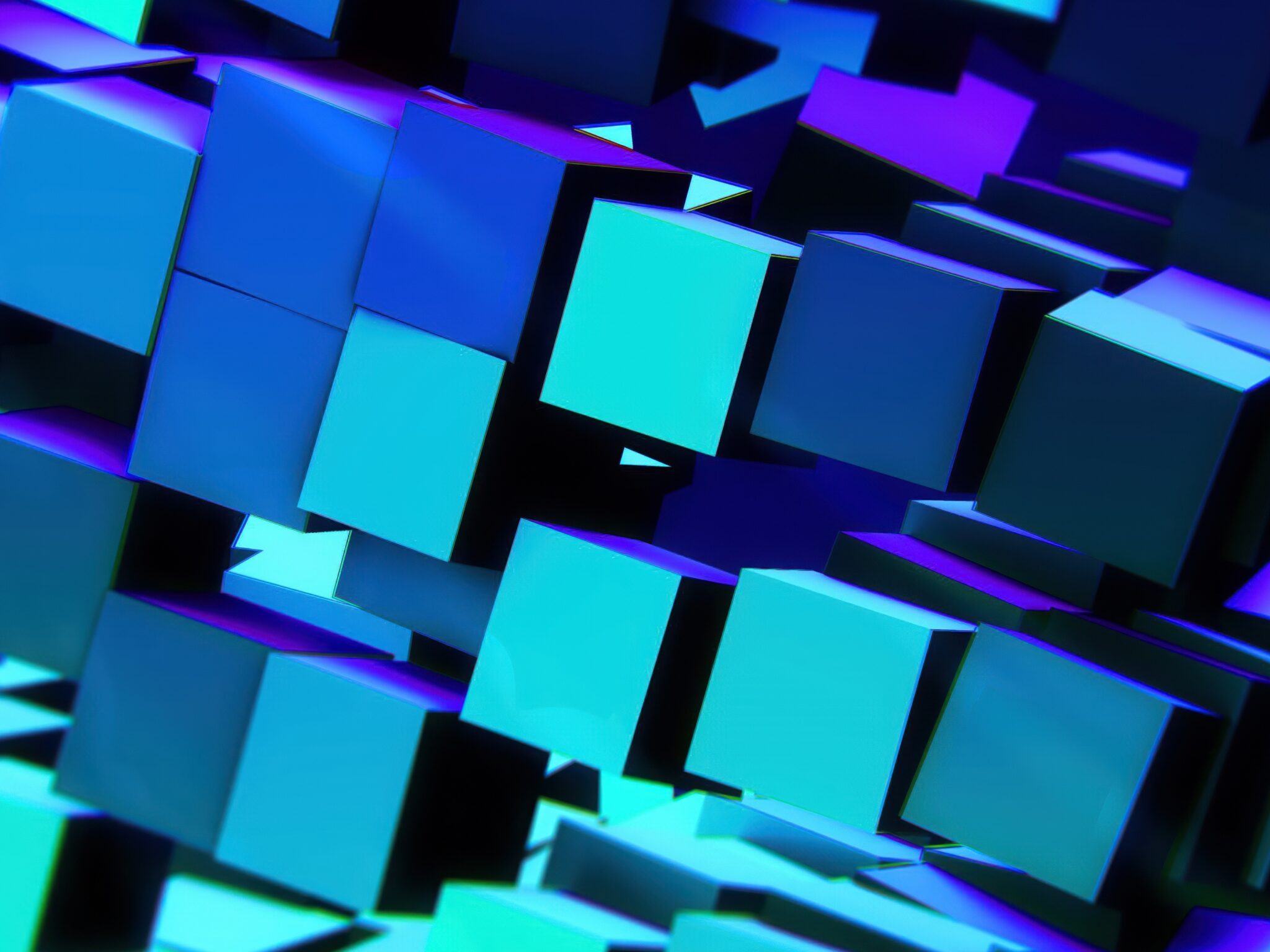 Overlapping cubic forms fill the frame, receding into darkness. Turquoise and purple light highlights the geometric shapes and sharp edges.