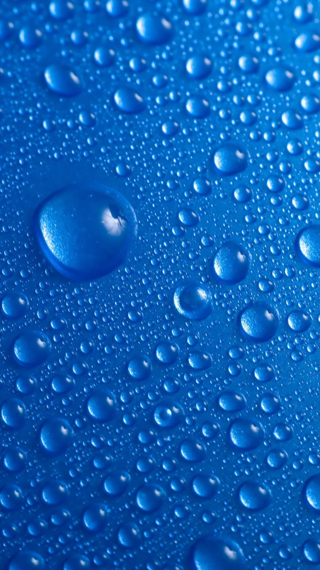Numerous water droplets cover a smooth, solid blue surface. Light reflects and refracts within each droplet, creating small highlights and a…