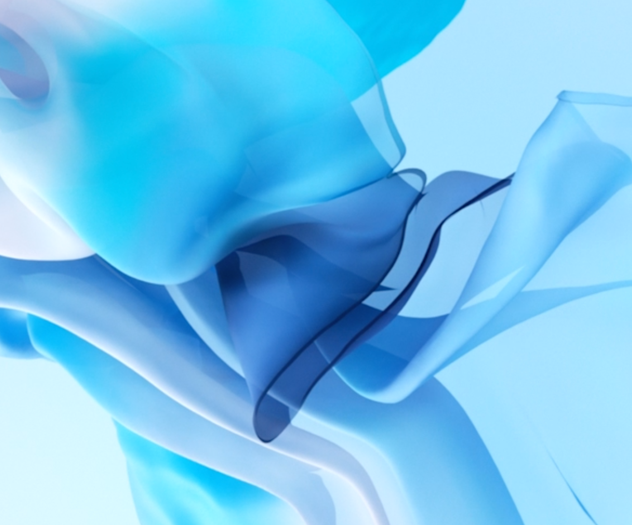 Pale blue and white abstract shapes are arranged in a dynamic, flowing composition. The textures appear soft and translucent, with highlights creating a sense of depth and light variation.