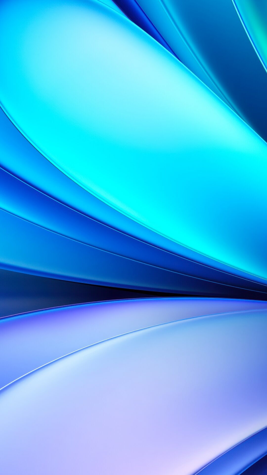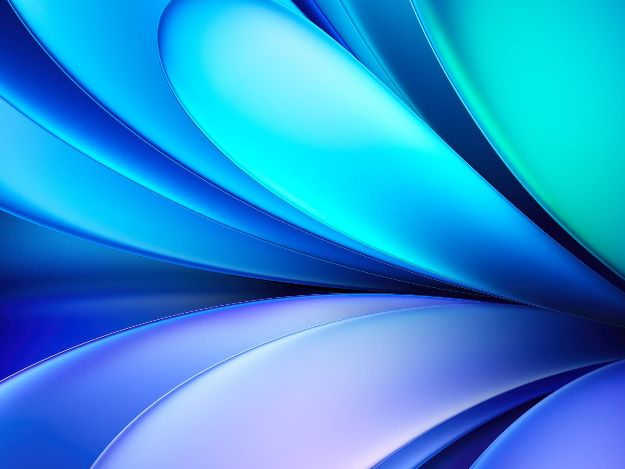 Smooth flowing curves in deep cobalt blue and soft cyan sweep across the frame, with hints of teal and violet in the shadows creating a slee…