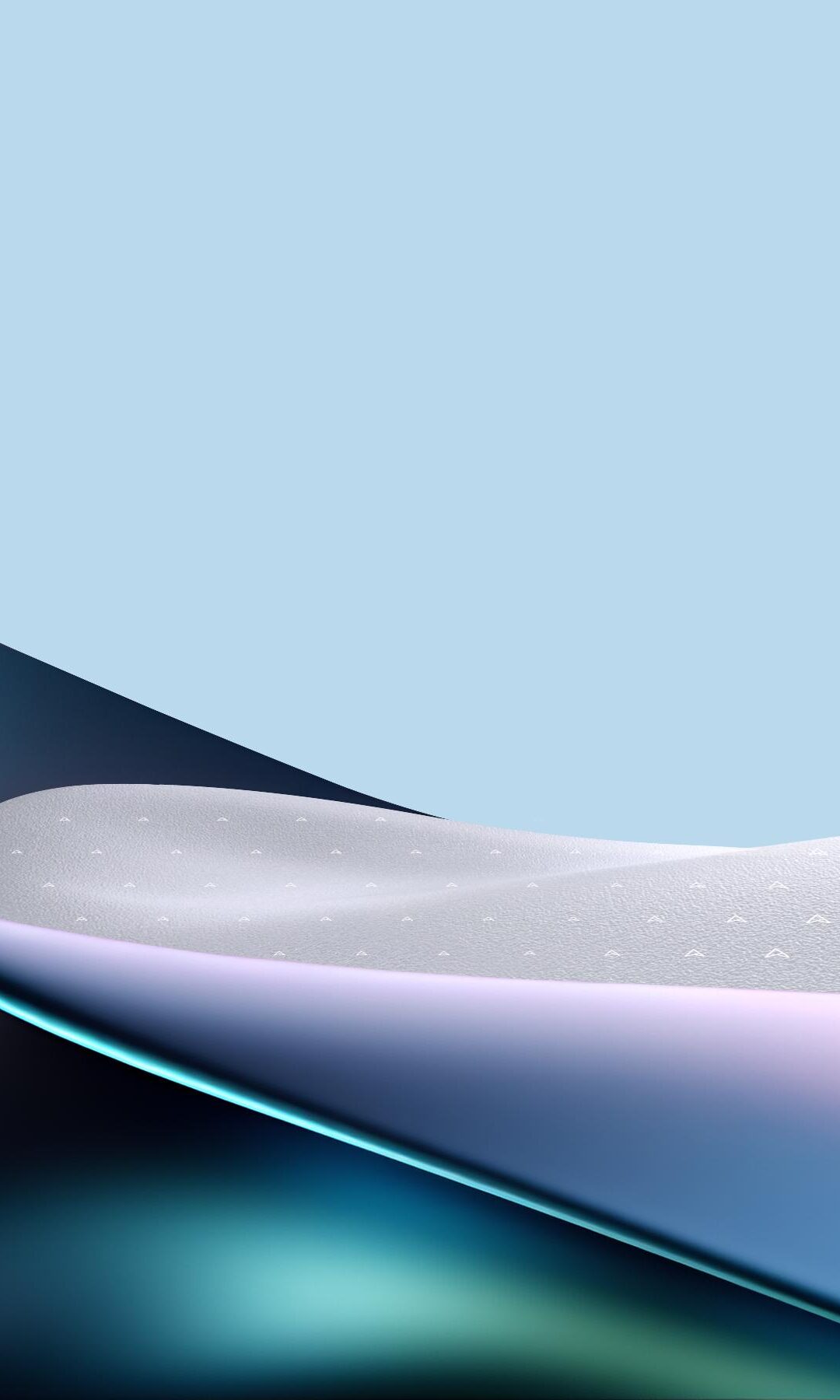Smooth, flowing curves dominate the composition against a pale blue background. Light reflects across the glossy surfaces, creating a subtle iridescent sheen with pink and teal highlights.