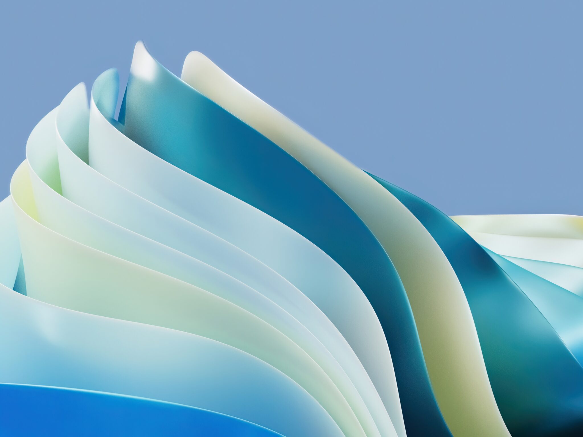 Overlapping curved shapes fill the frame, primarily in shades of blue, yellow, and white. Soft, diffused light creates subtle shading and hi…