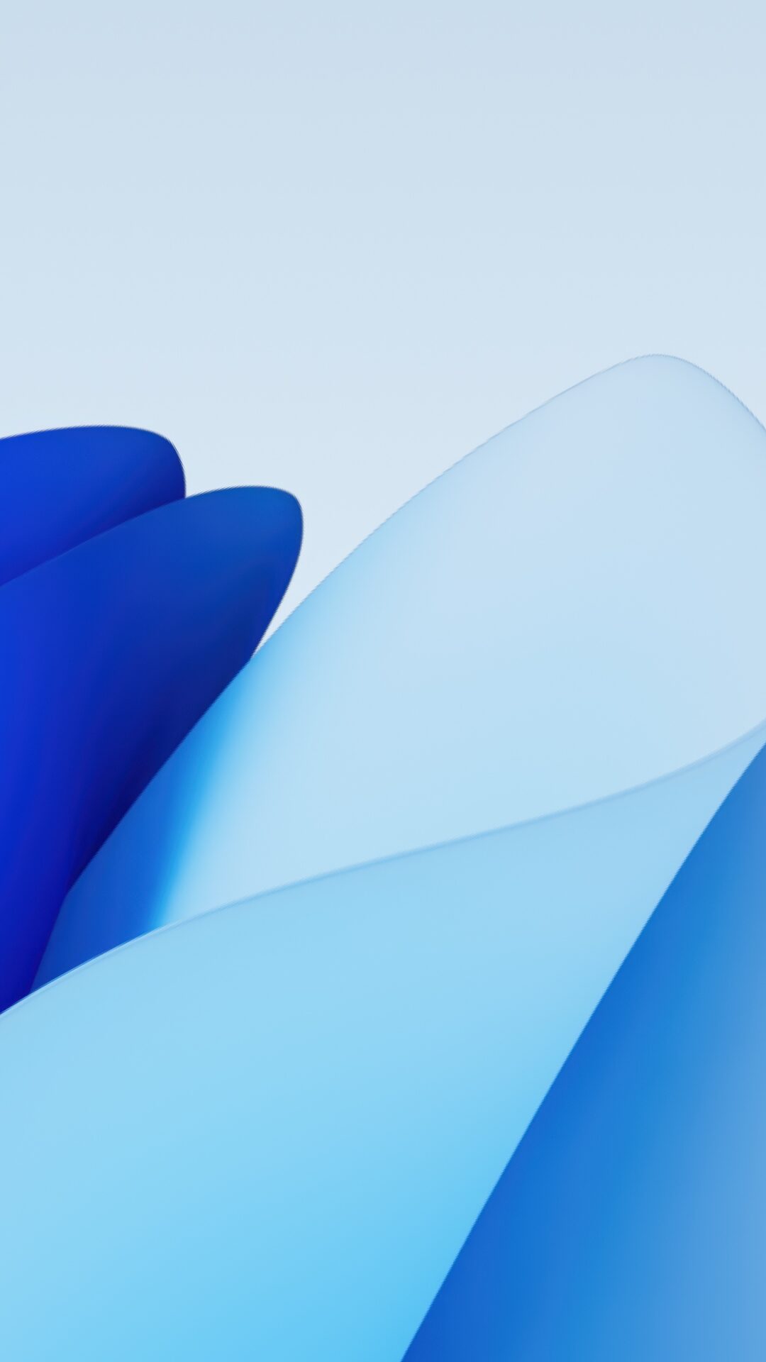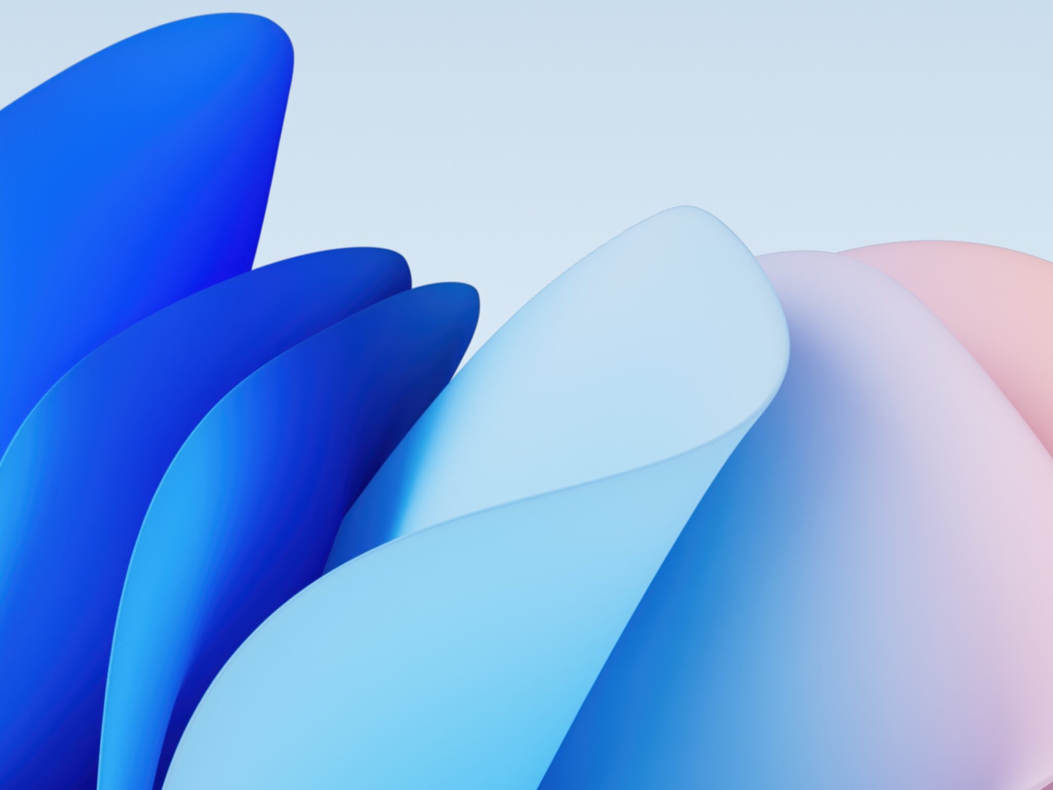 Curved, overlapping shapes fill the frame, ranging from deep blue to pale pink. The surfaces are smooth and reflect soft, diffuse light with