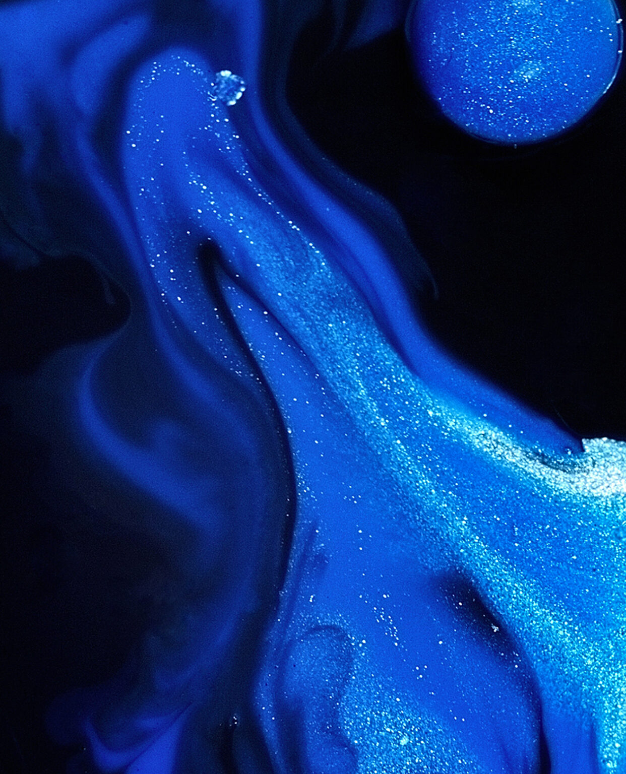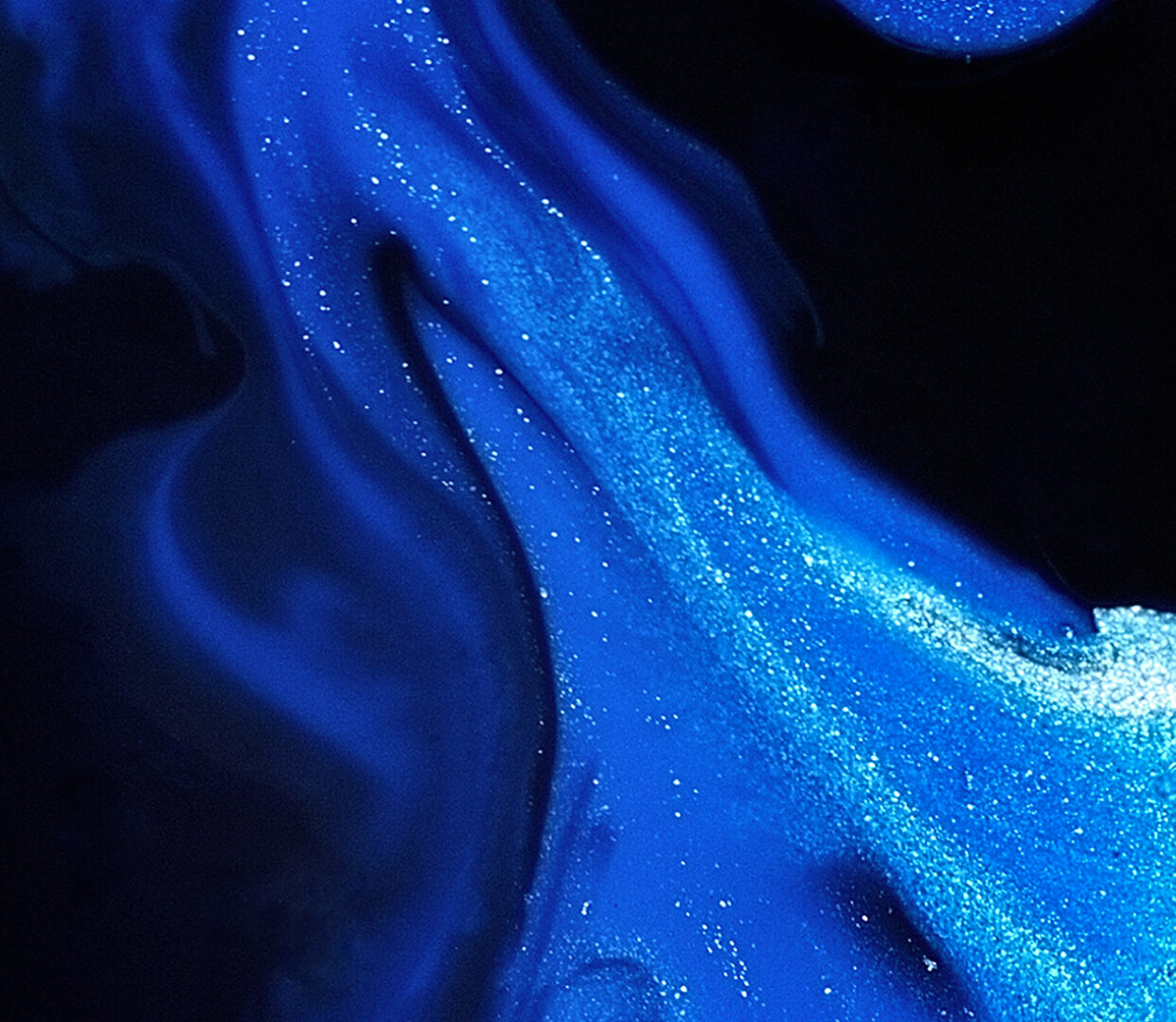 Abstract blue ink creates flowing shapes against a dark background. Fine glitter particles are suspended within the paint, reflecting the light and adding texture.