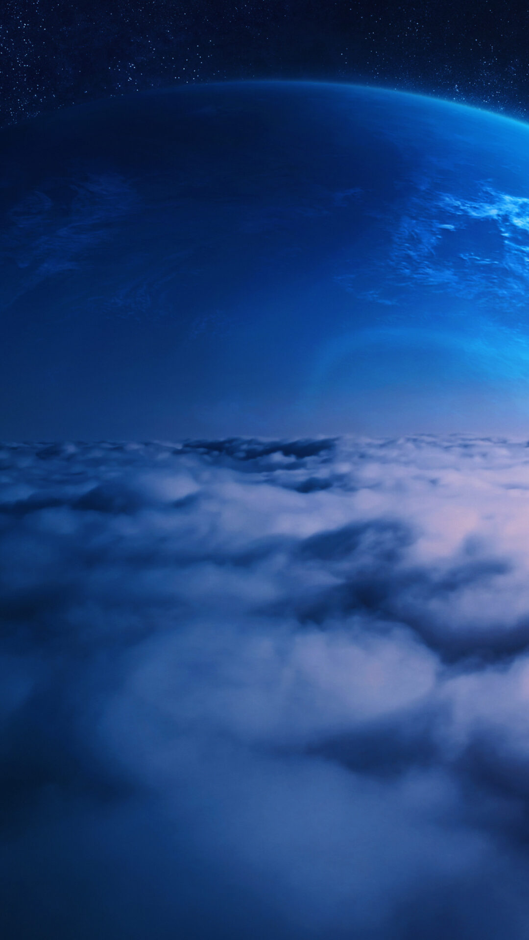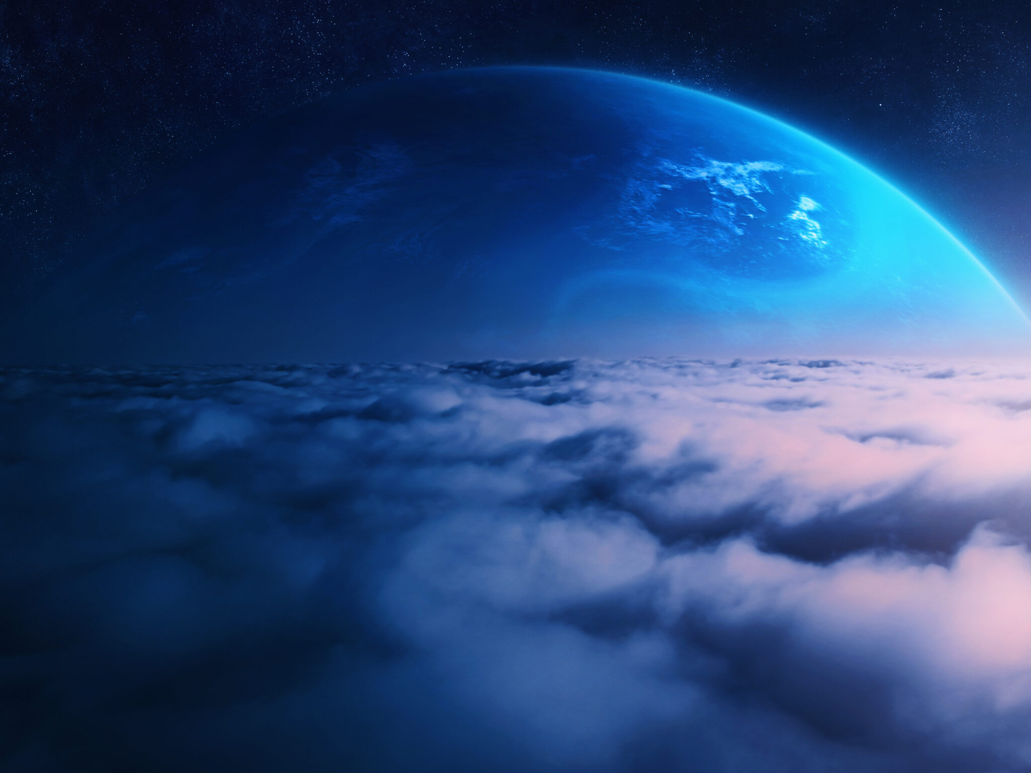 Dreamy space scene featuring a brilliant blue planet with glowing edges rising above soft pink and purple clouds against a starry black sky. Works beautifully as a desktop wallpaper for 4K monitors.