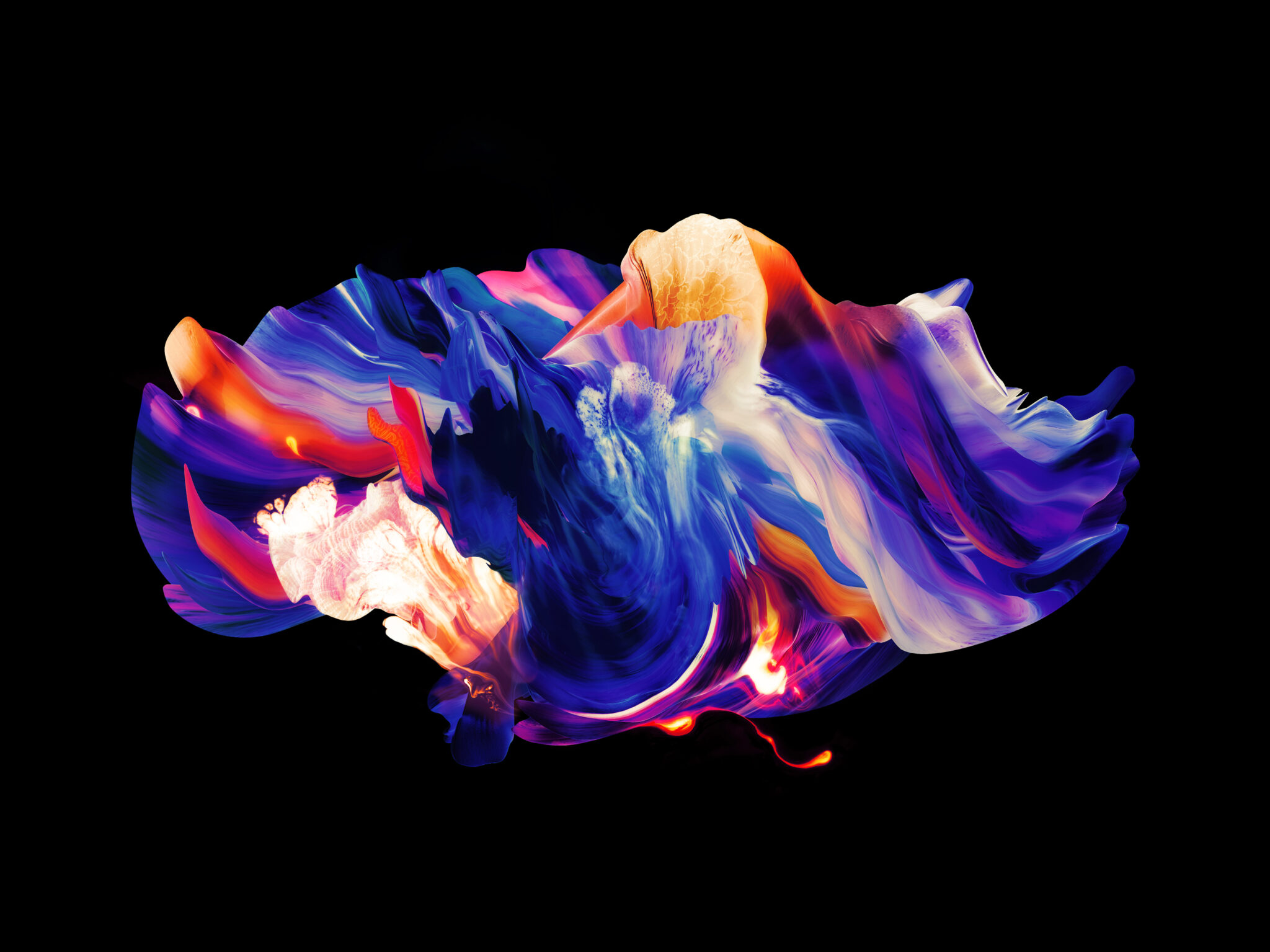 Deep cerulean and rich purple bleed into warm orange and red in a swirling, turbulent abstract form set against pitch black. The clash of co…