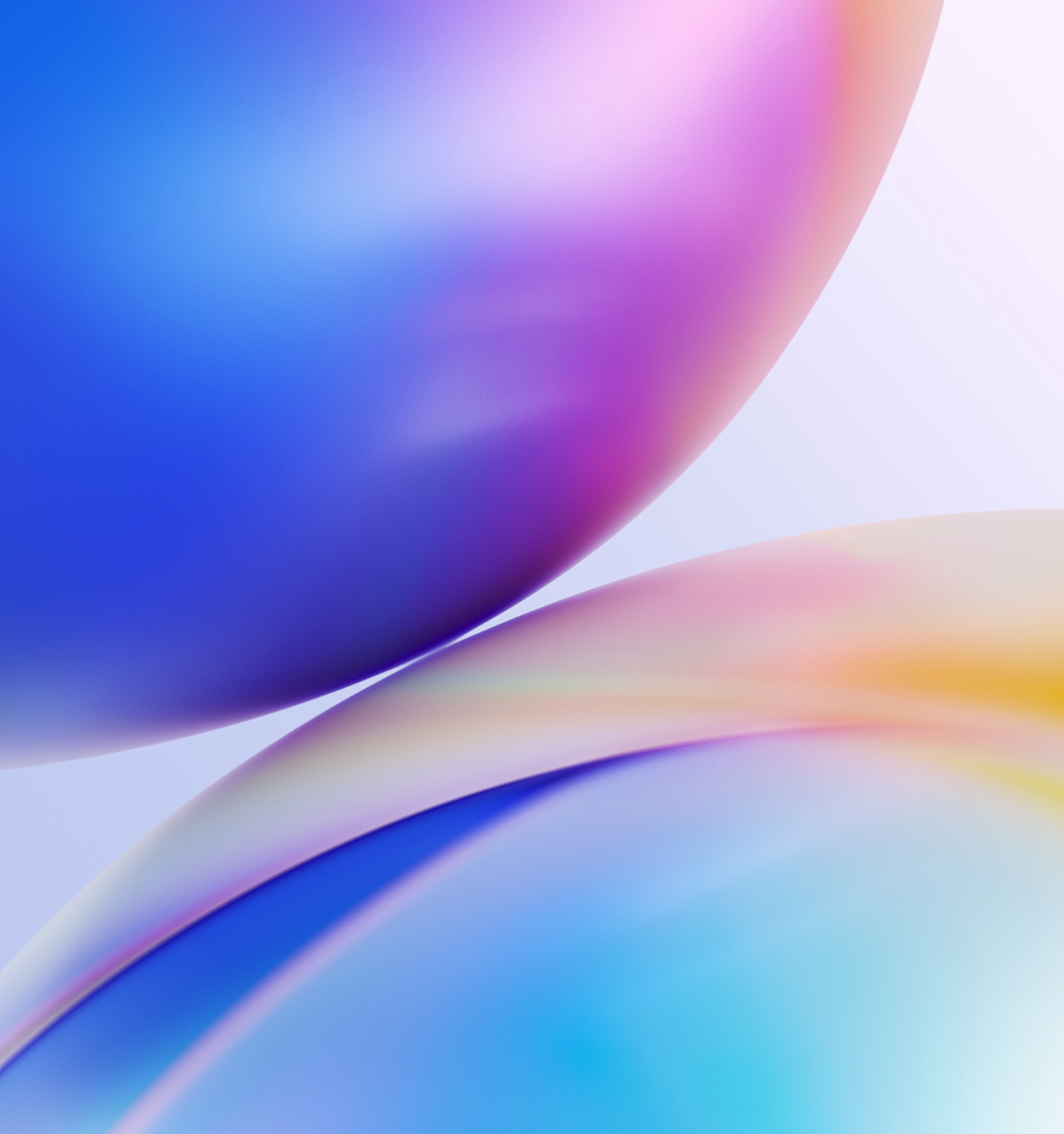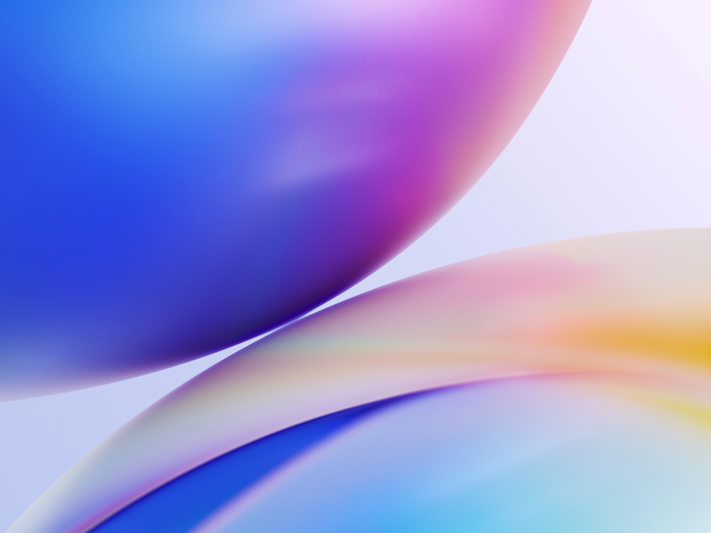 Overlapping rounded forms fill the frame with a gradient of blue, purple, and yellow. The smooth surfaces reflect light, creating soft color