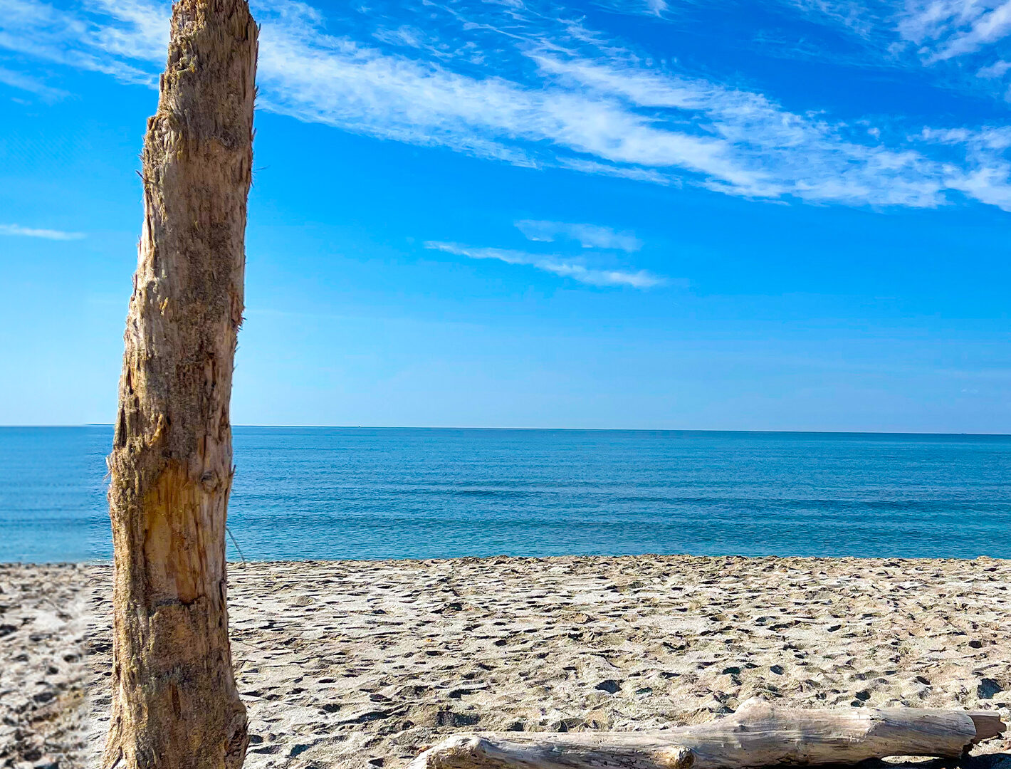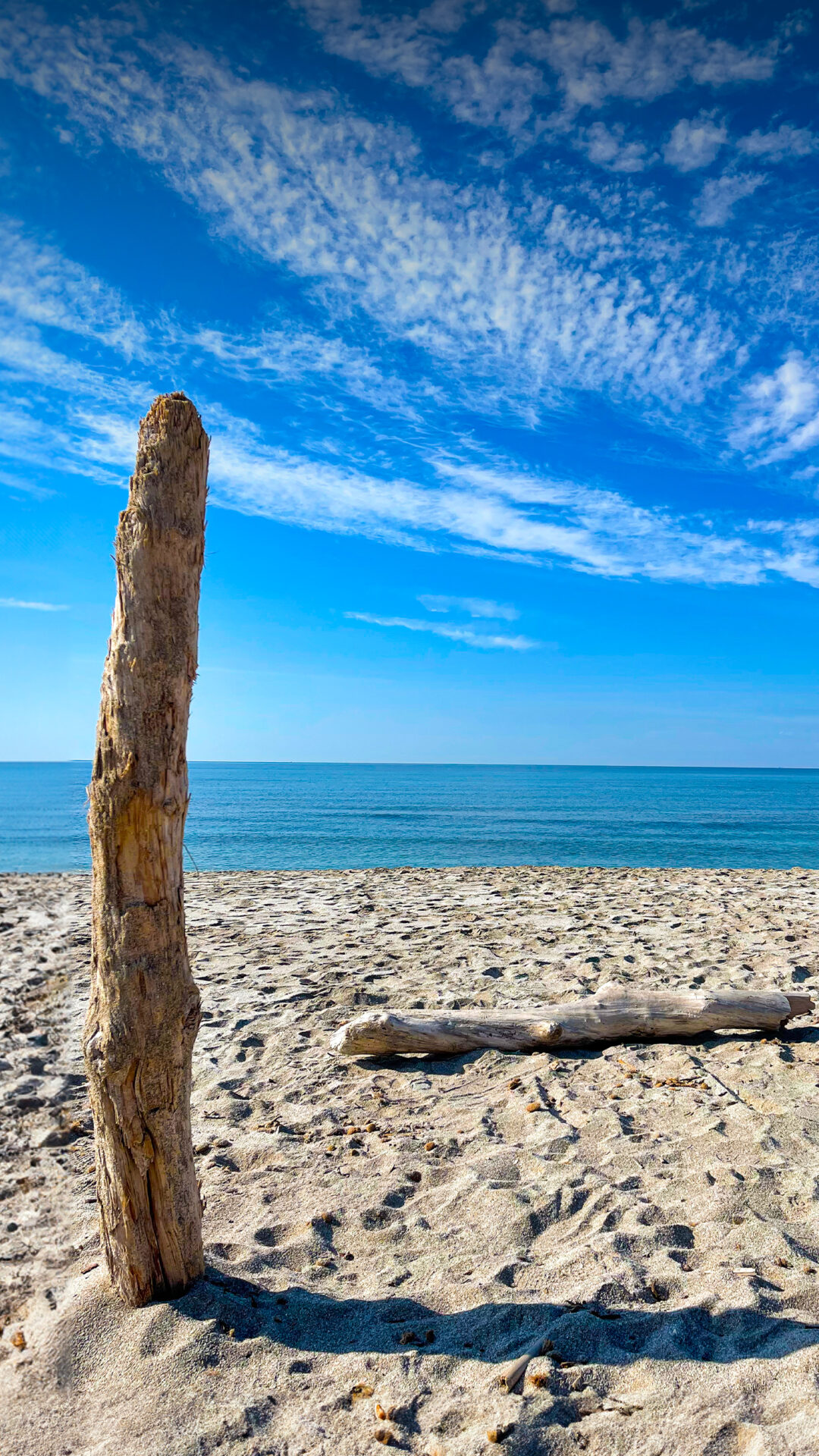 A sandy beach with a vertical piece of driftwood stands before a calm, blue ocean. The bright sunlight casts a defined shadow from the wood …
