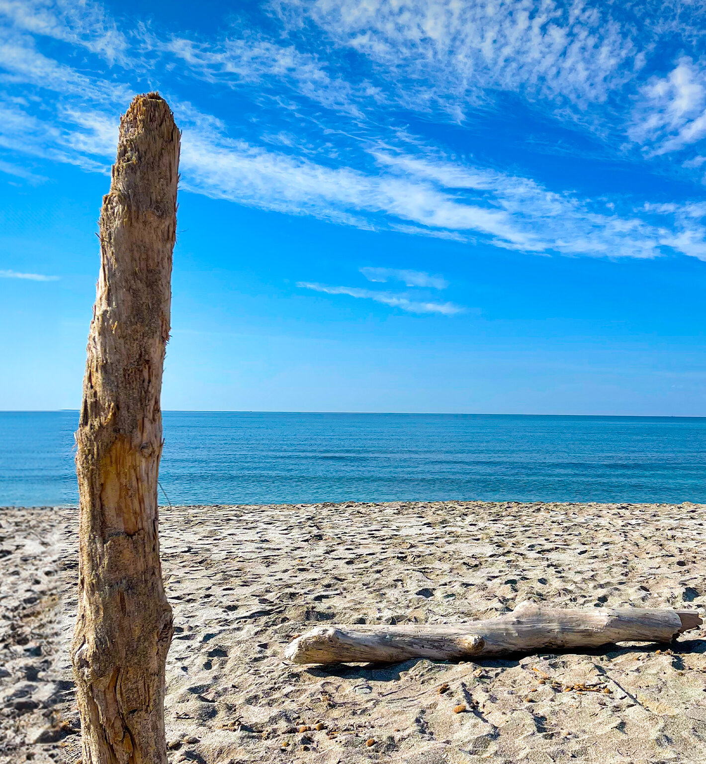 A sandy beach with a vertical piece of driftwood stands before a calm, blue ocean. The bright sunlight casts a defined shadow from the wood onto the textured sand.