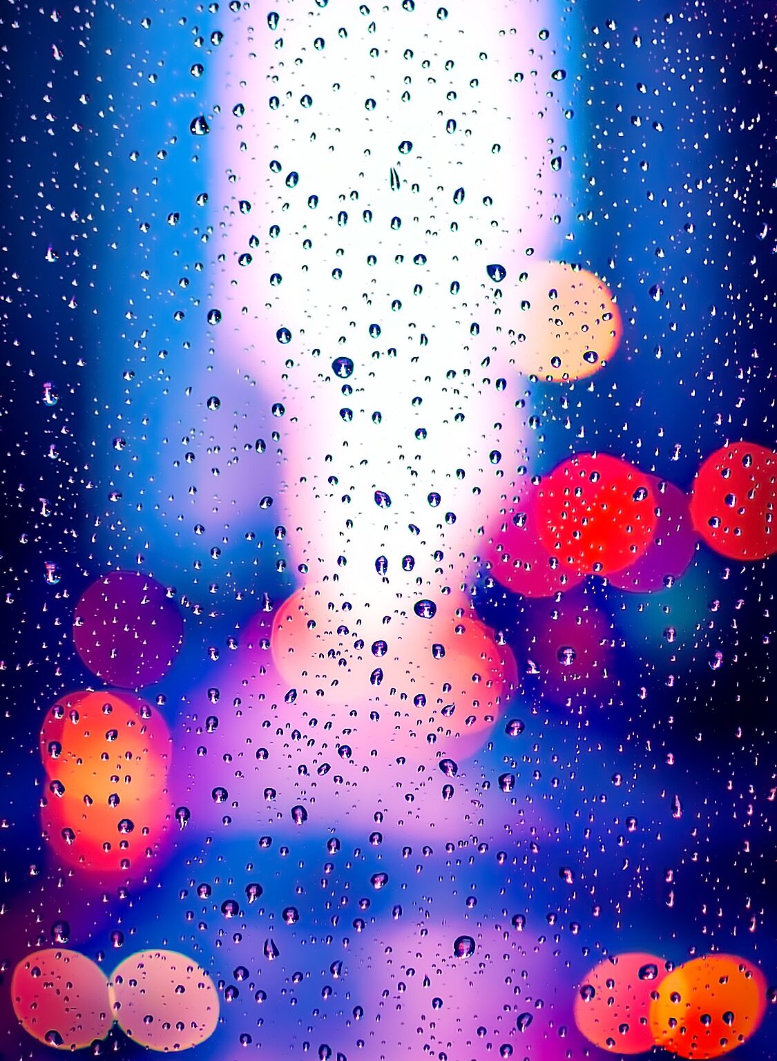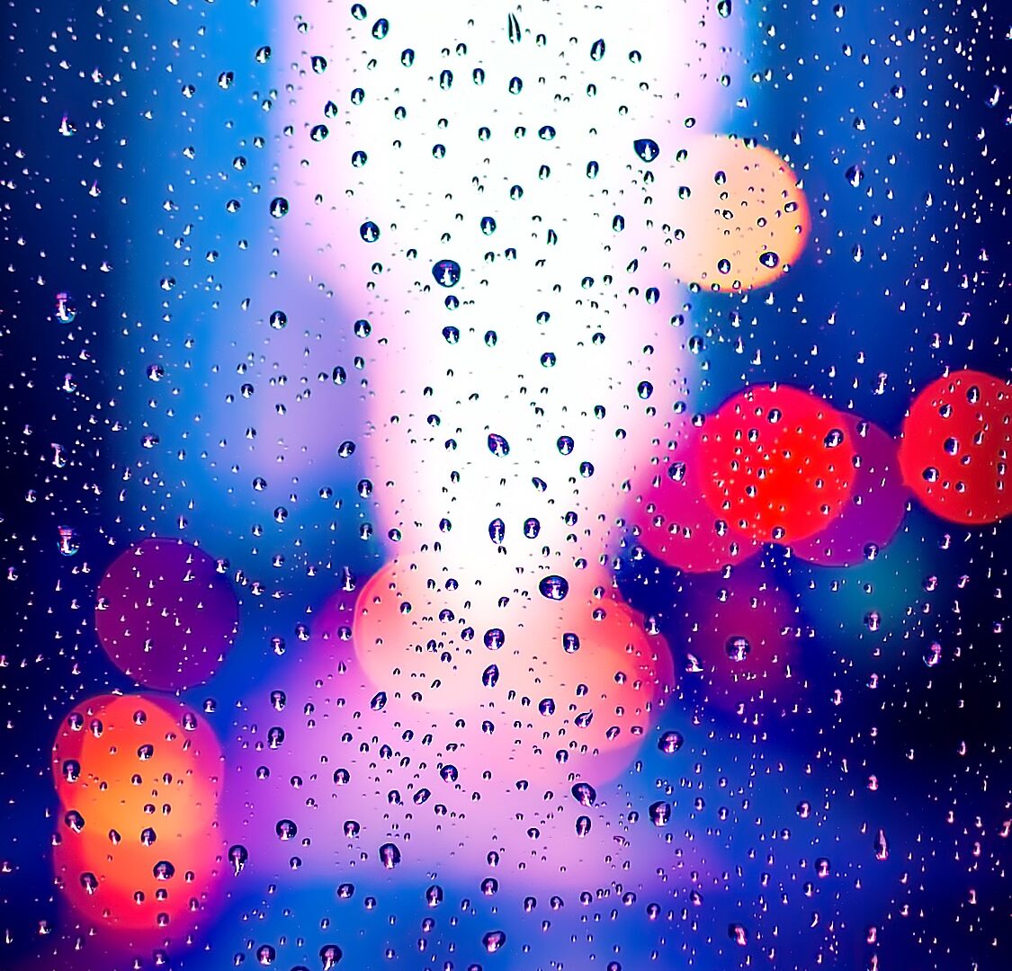 Streaks of water cover a window looking out onto blurred, round lights. The blue and purple tones create a cool, muted atmosphere through th
