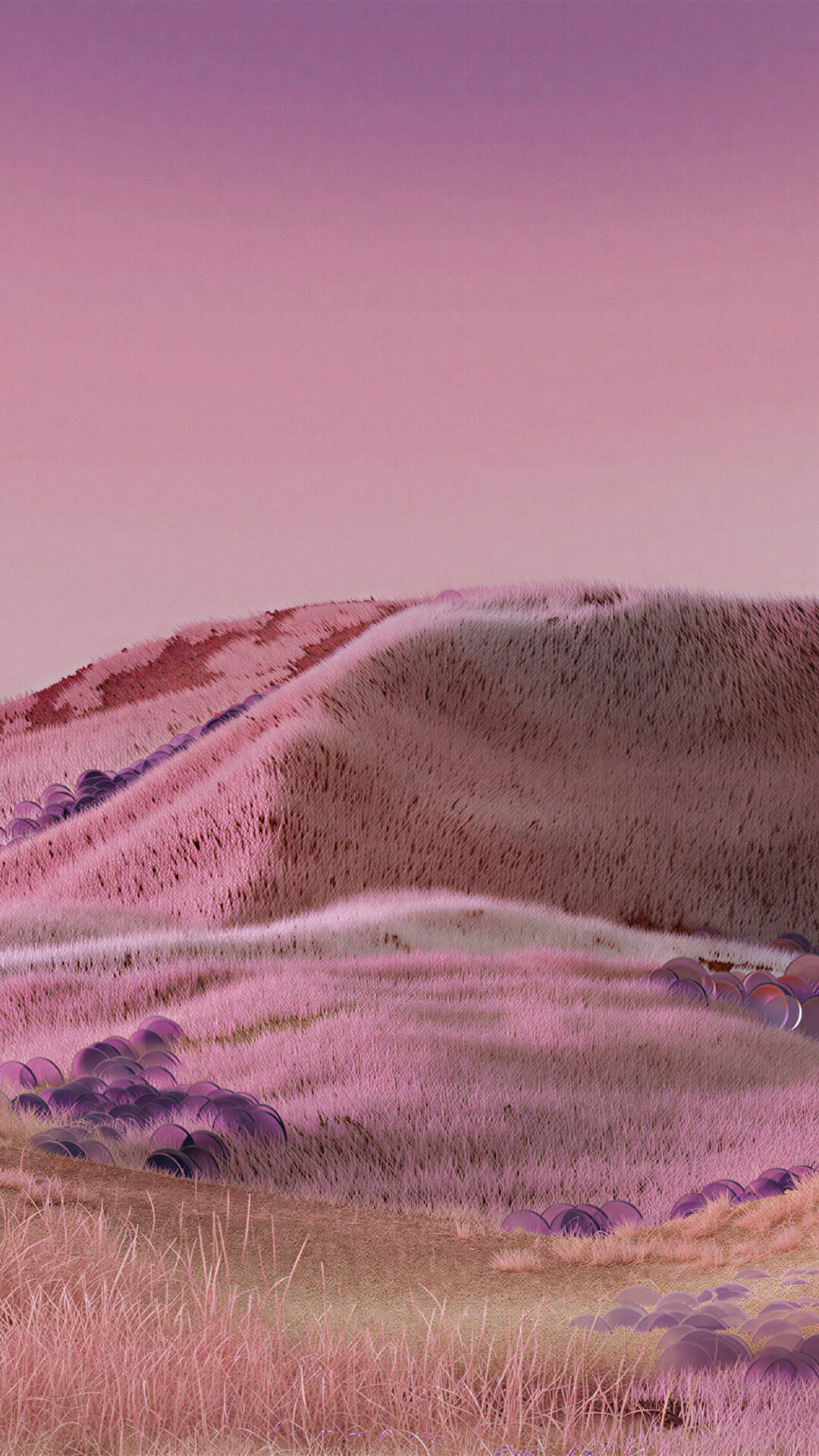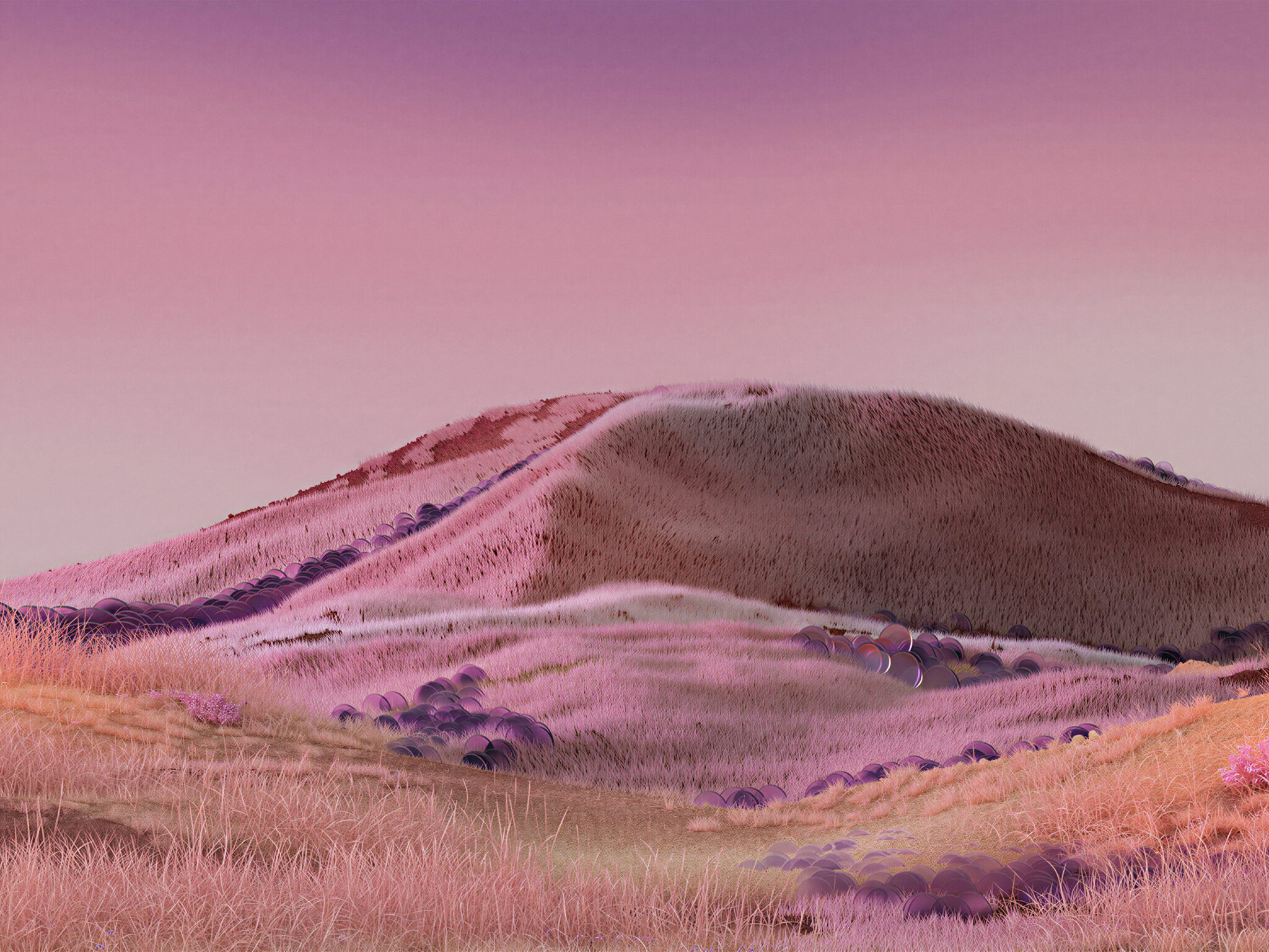 Surreal rolling hills in soft mauve, dusty pink and golden amber tones with scattered purple shrubs dotting the dreamy landscape under a haz