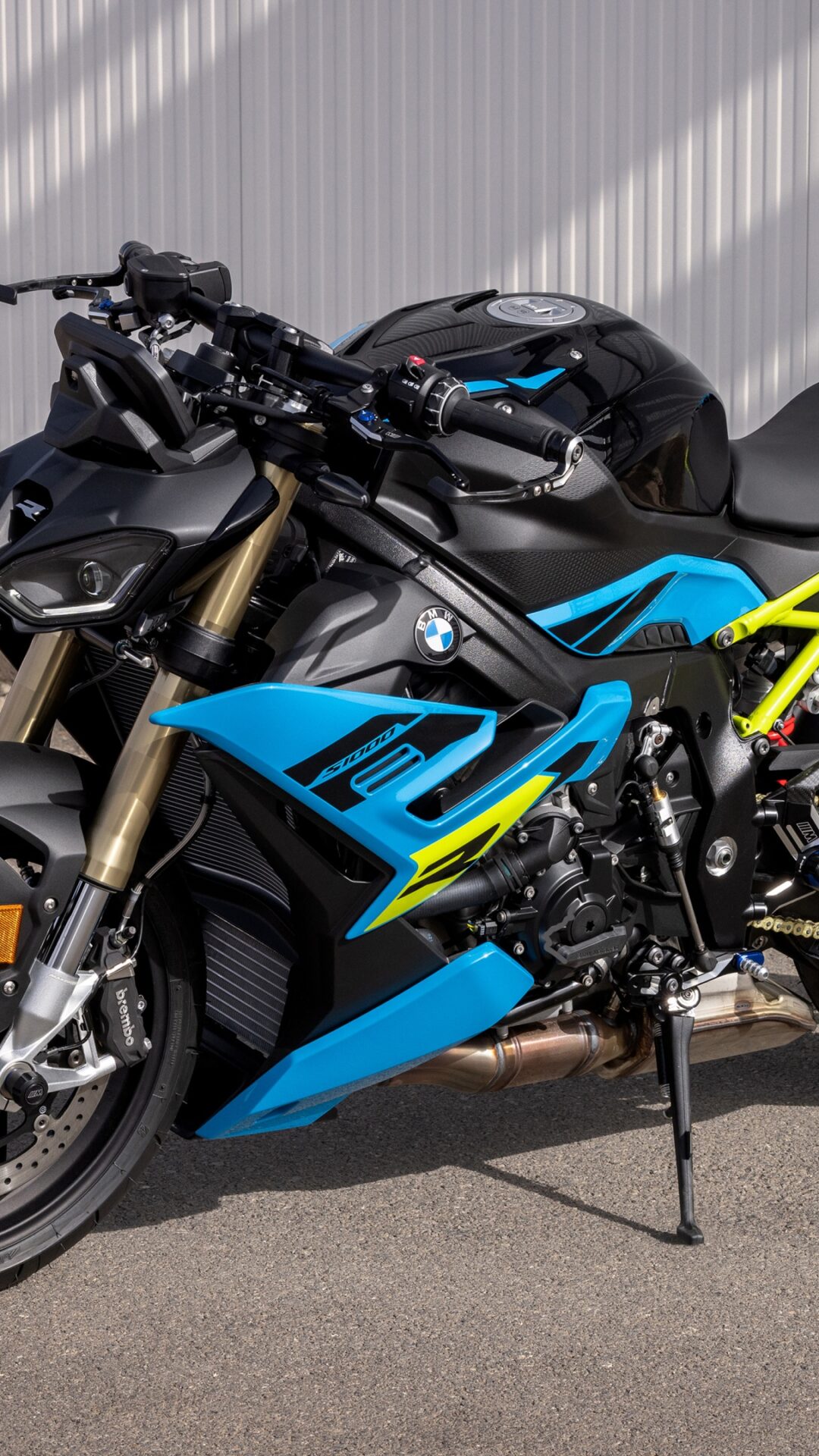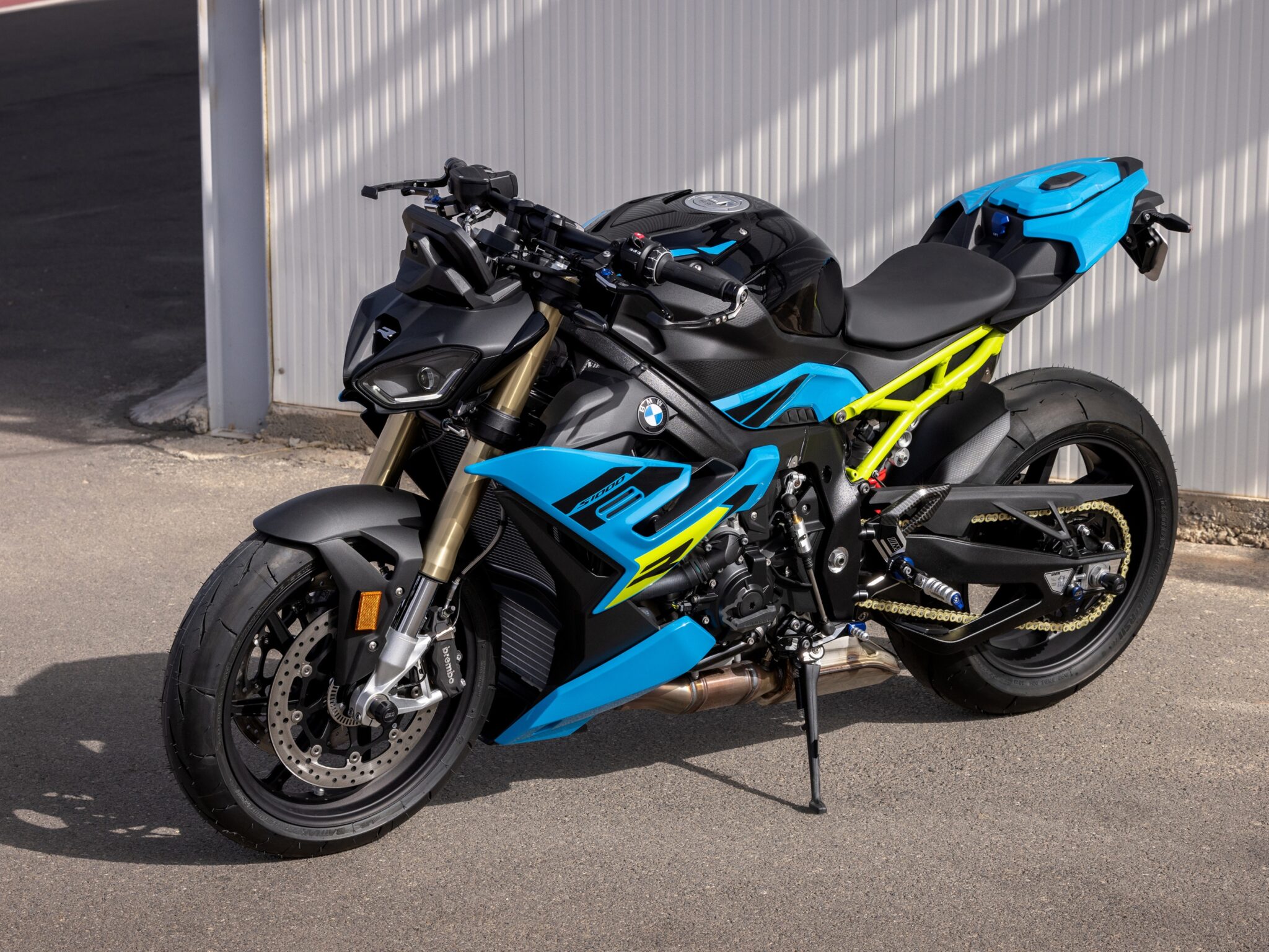 A blue and black BMW S1000R sport bike is parked on asphalt near a metal wall. The bike’s angular bodywork is highlighted with bright yellow