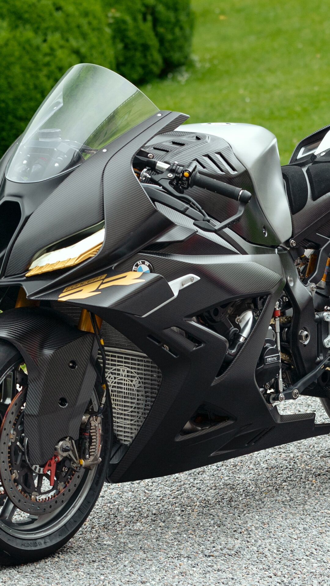 A dark grey BMW S1000RR sport bike is parked on gravel beside manicured green lawns. Highlights on the fairing and yellow headlights add contrast to the matte finish and create strong depth.