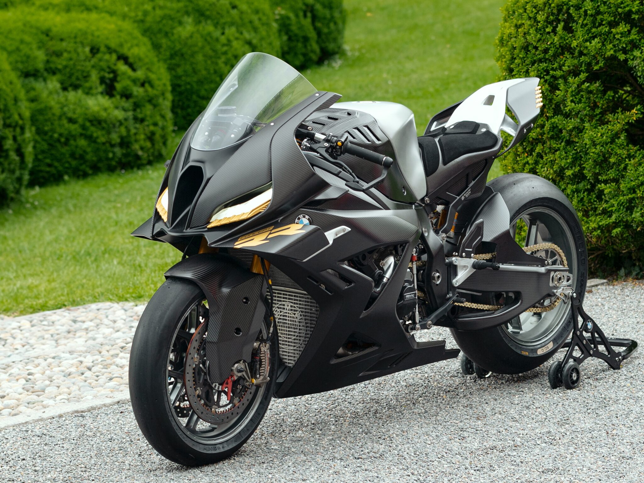 A dark grey BMW S1000RR sport bike is parked on gravel beside manicured green lawns. Highlights on the fairing and yellow headlights add con…