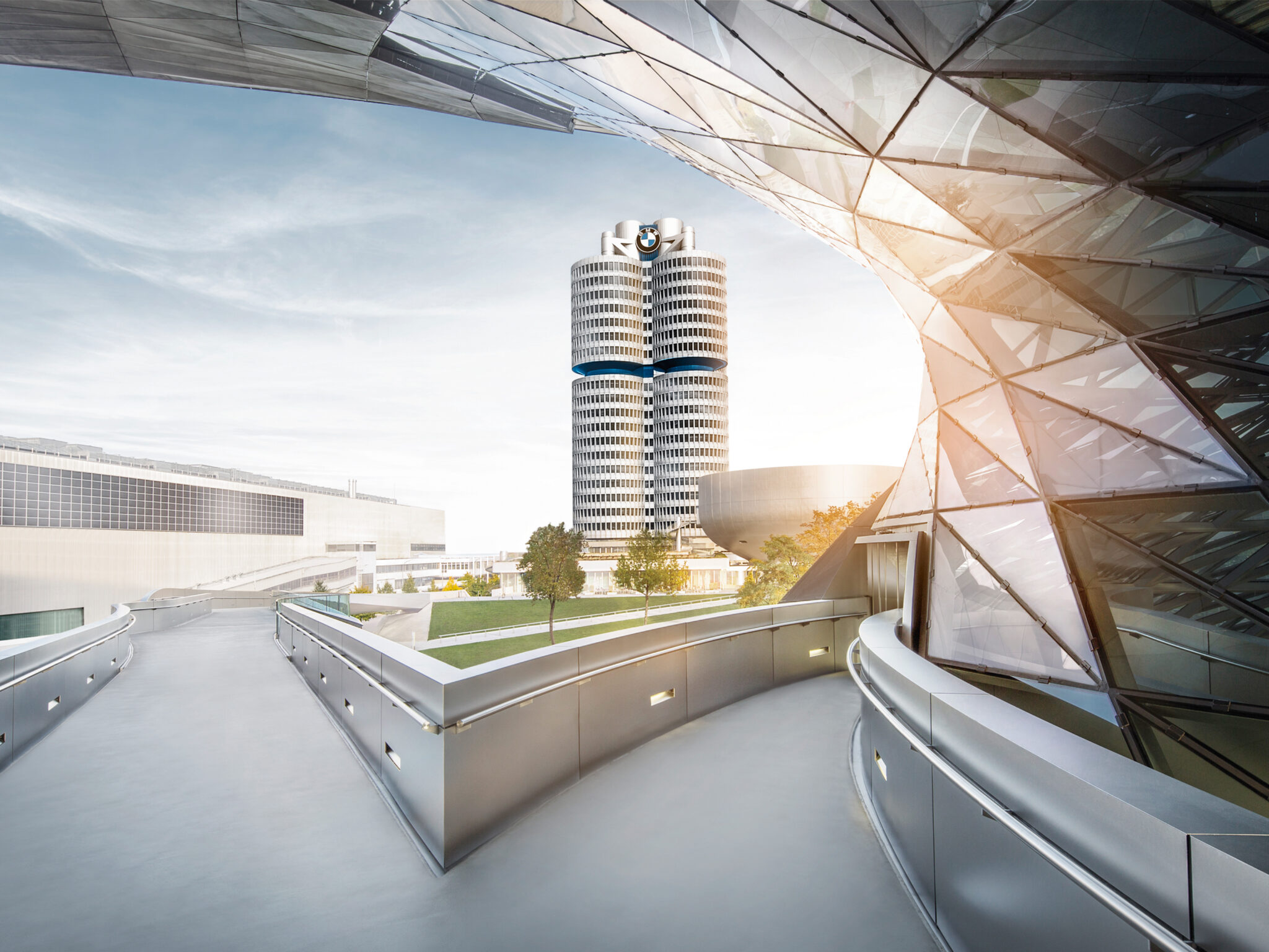 A curved walkway leads toward a tall building with a distinctive BMW logo and blue tinted windows. Sunlight flares through a geometric glass…