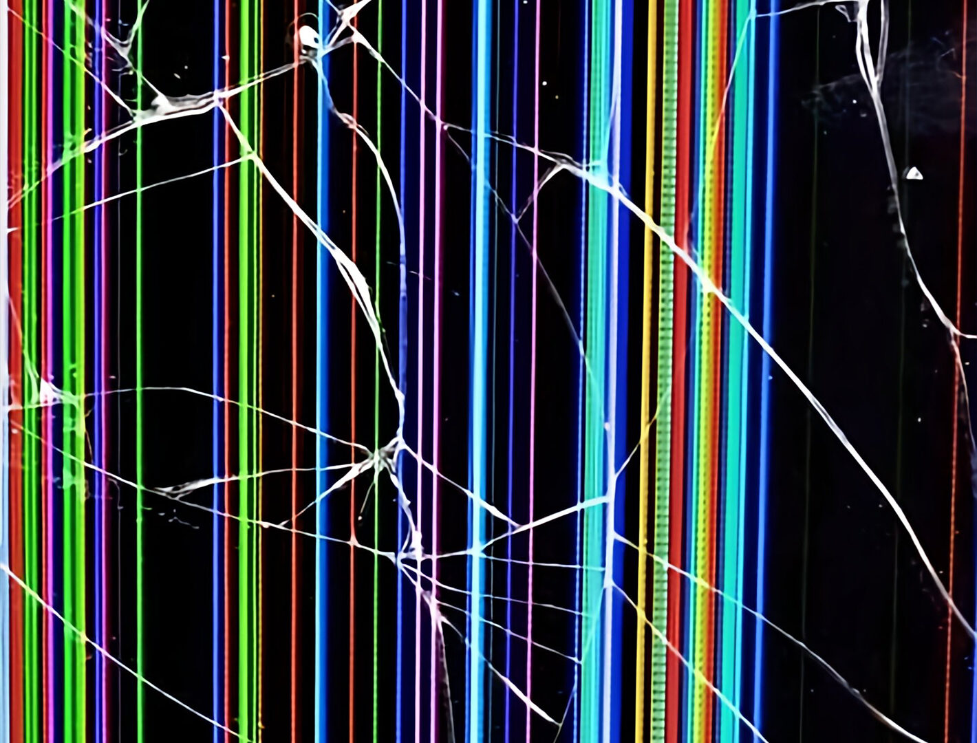 A black background is filled with numerous brightly colored vertical lines and fractured cracks. The scattered white cracks provide a stark …