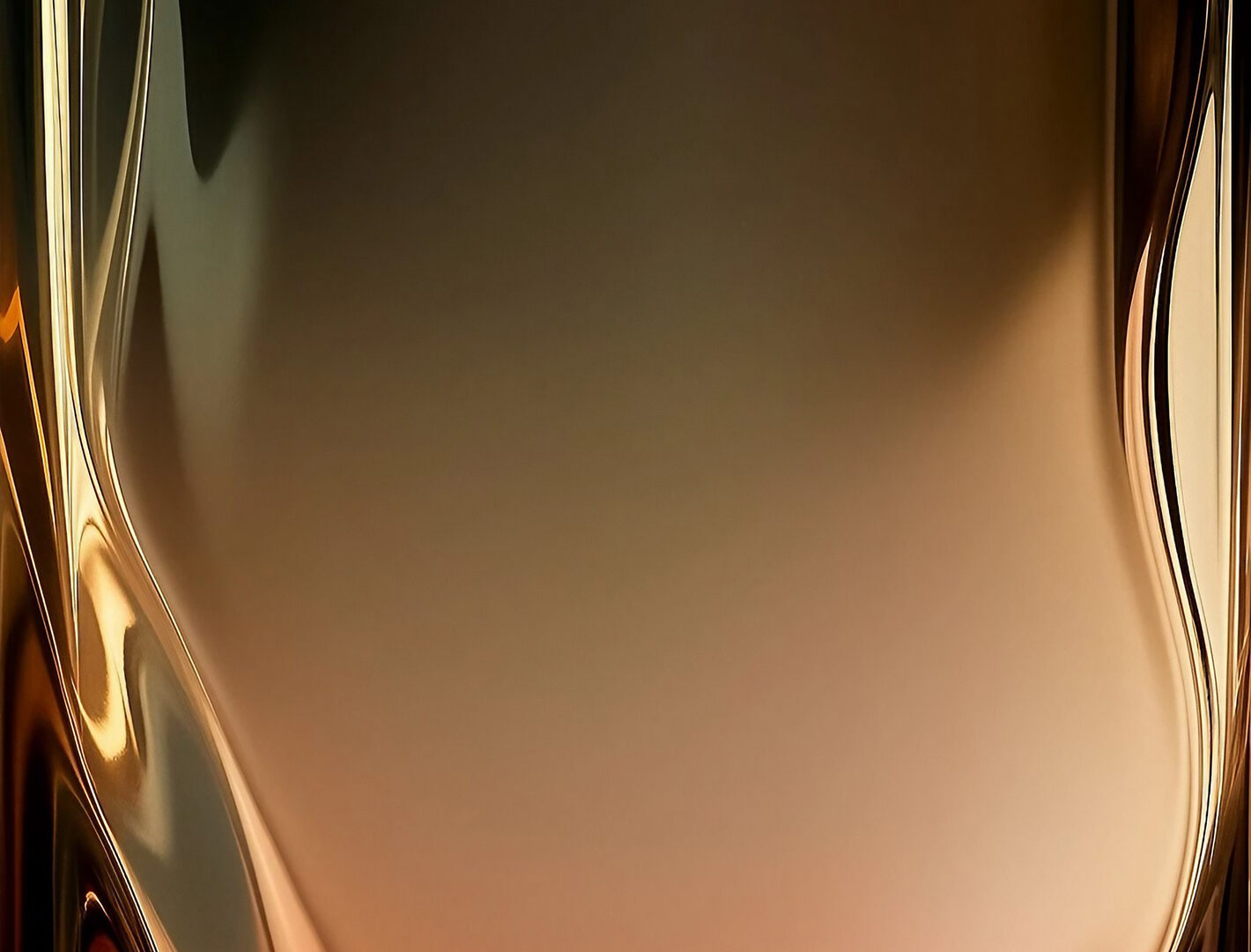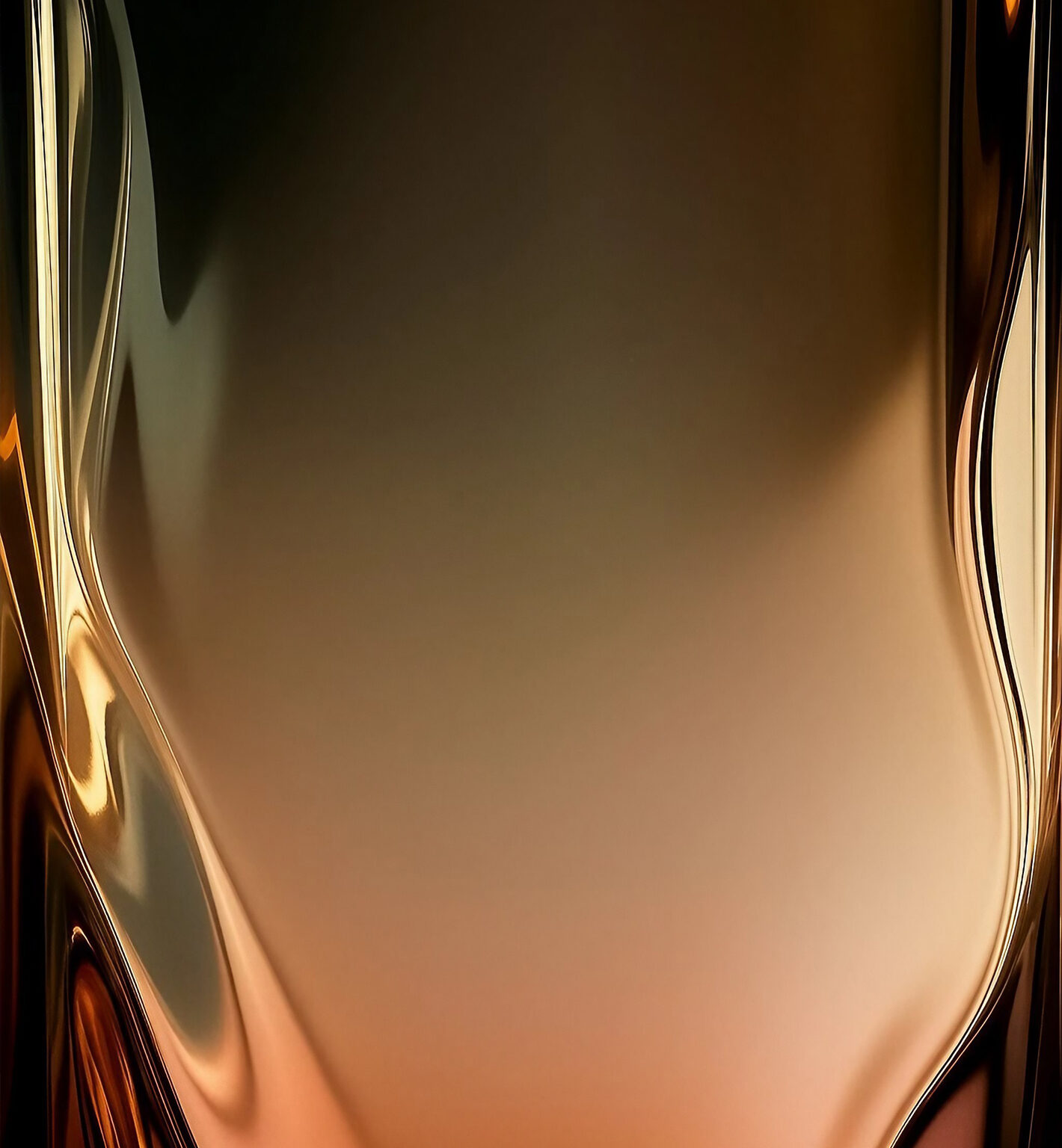A flowing abstract form fills the frame with a dark background. Warm bronze and gold tones create a highly reflective and smooth surface wit