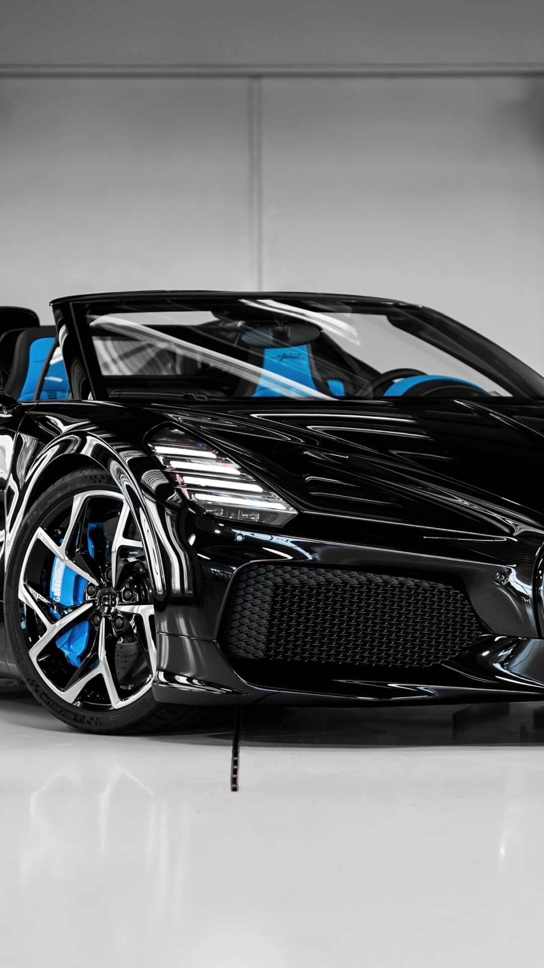 A black Bugatti Chiron Super Sport is centered in a bright, indoor garage space. The car's wheels have striking blue accents, contrasting w…