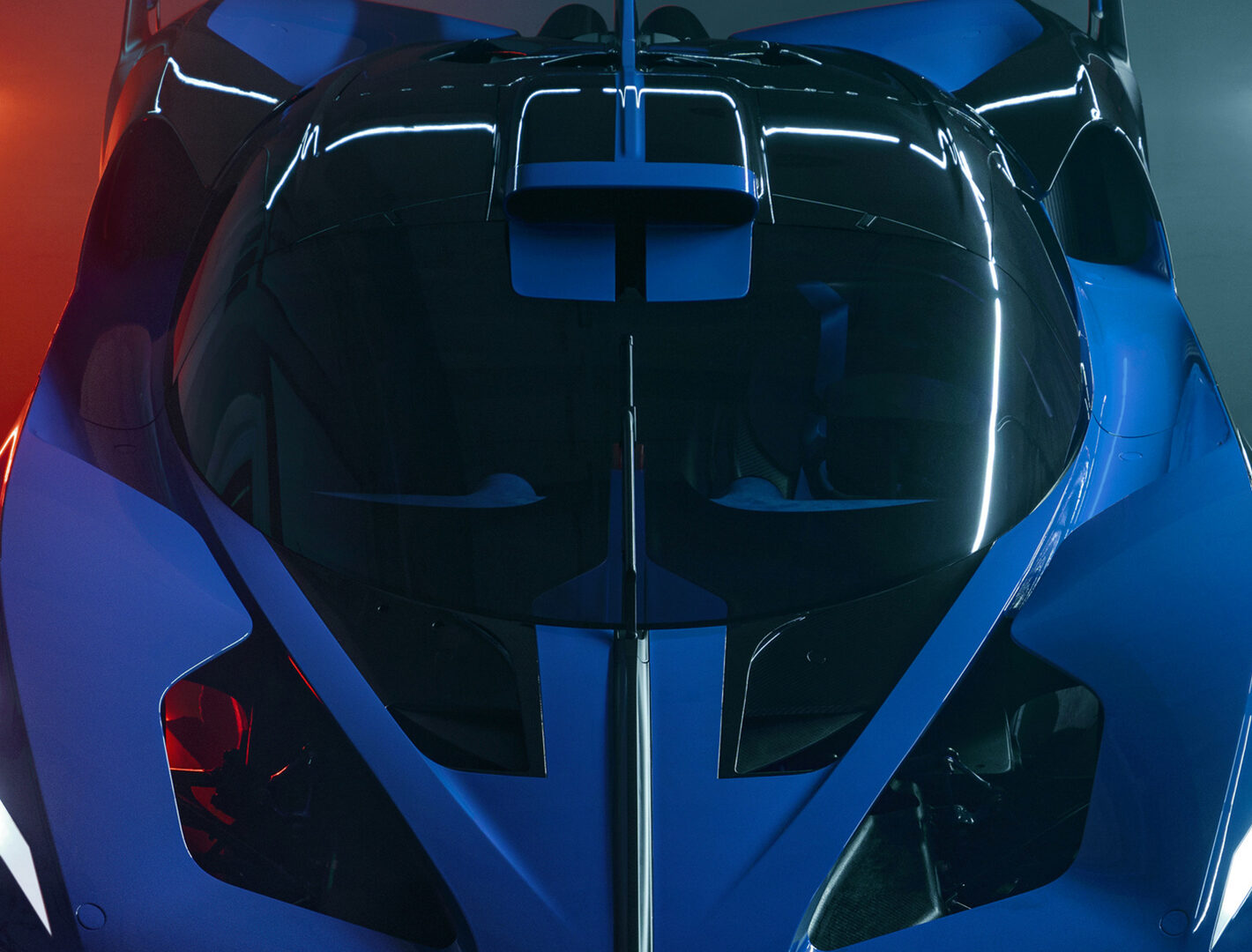 A blue Bugatti Divo is centered in a dark setting, viewed directly from the front. Red and orange light accents the car's aerodynamic curves