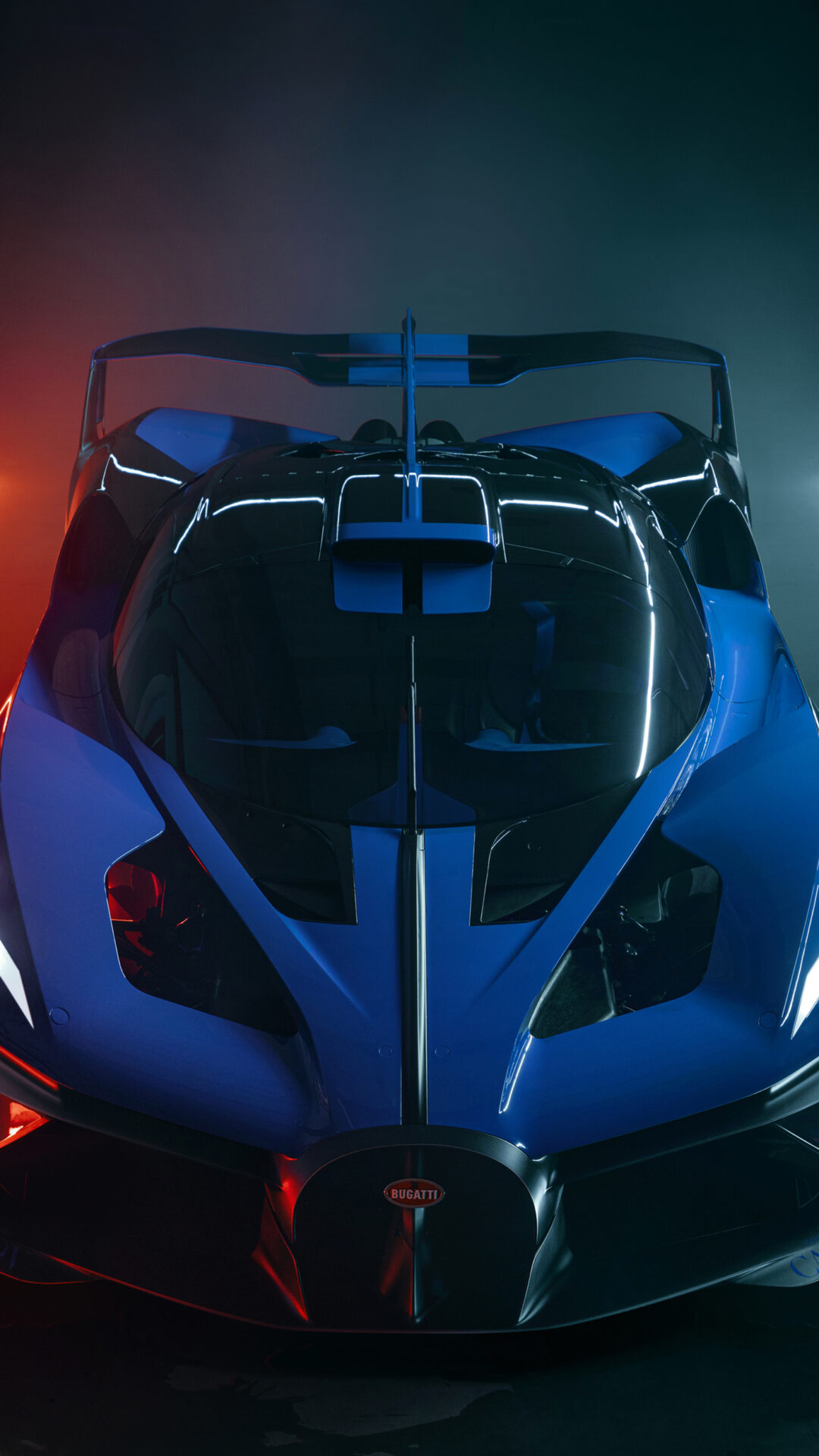 A blue Bugatti Divo is centered in a dark setting, viewed directly from the front. Red and orange light accents the car's aerodynamic curves…