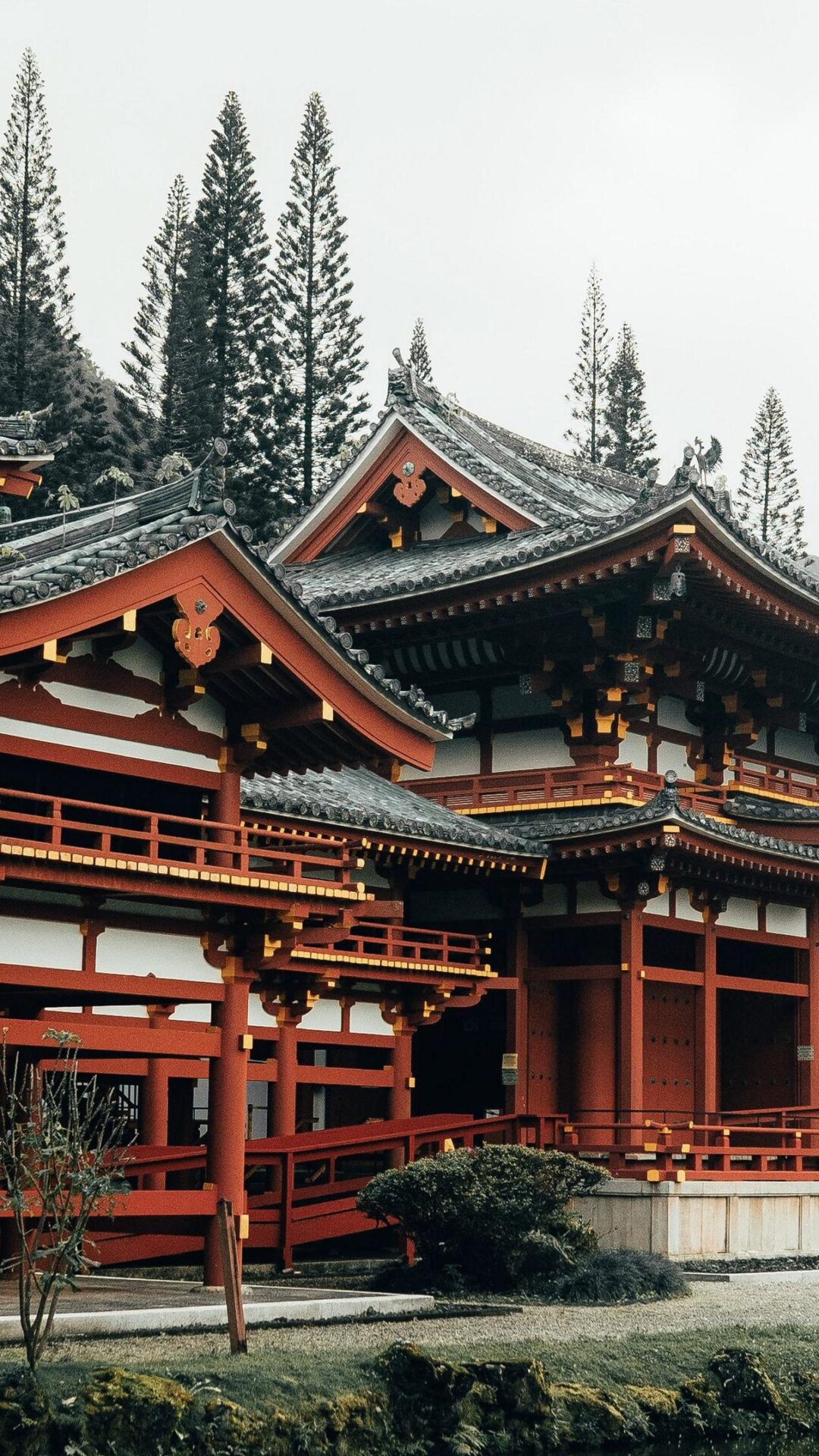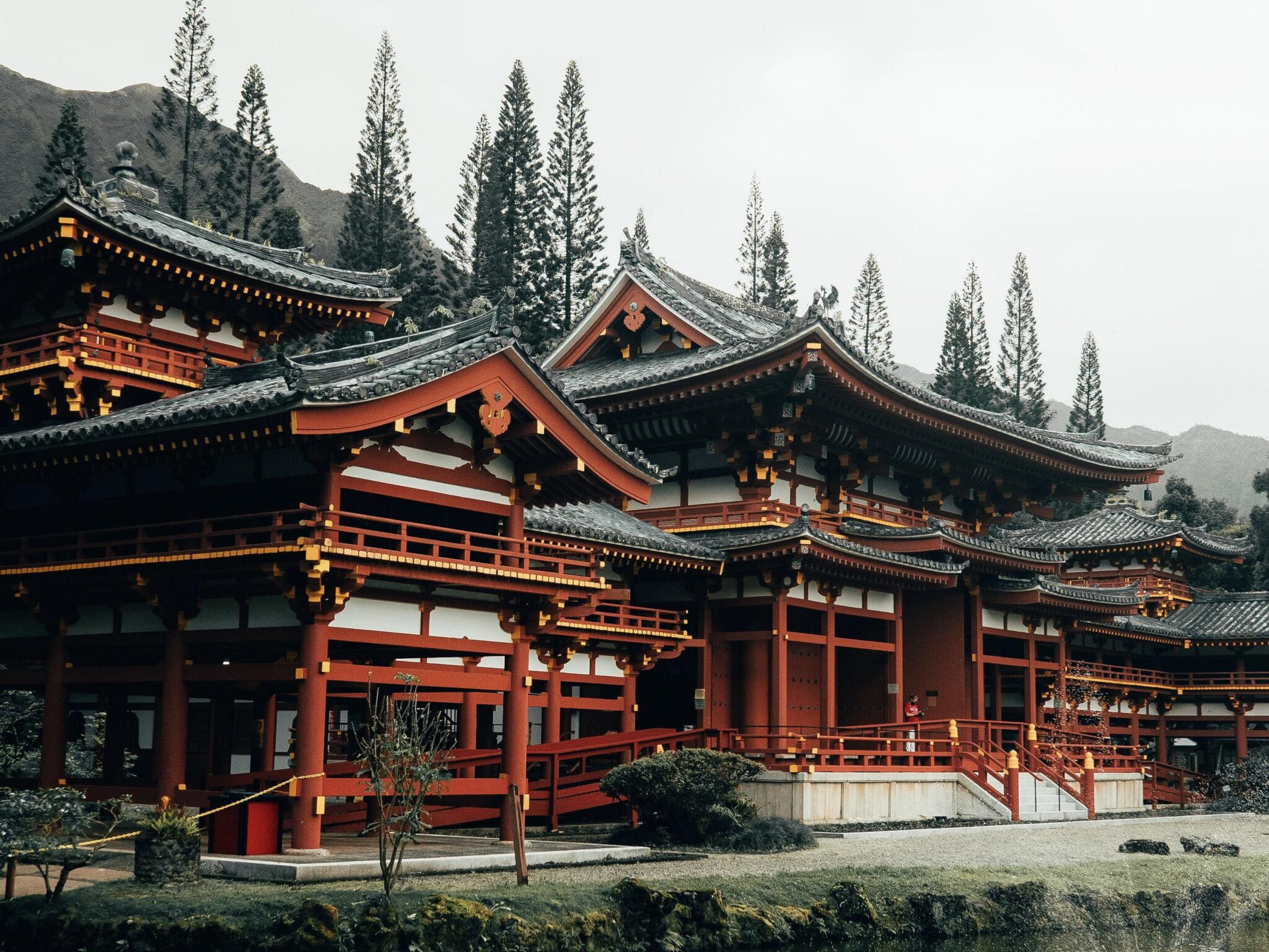 The Oahu Byodo-In replica rises in bold red and black tiers, flanked by conifers and distant volcanic ridges under a flat grey sky. Its symmetrical grandeur feels pulled straight from Heian-era Japan.