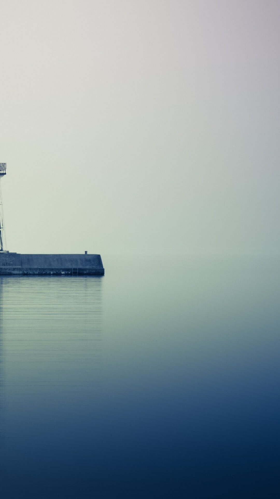 A lighthouse stands at the end of a stone pier extending into still water. The image uses a muted palette of grays and blues, and the compos