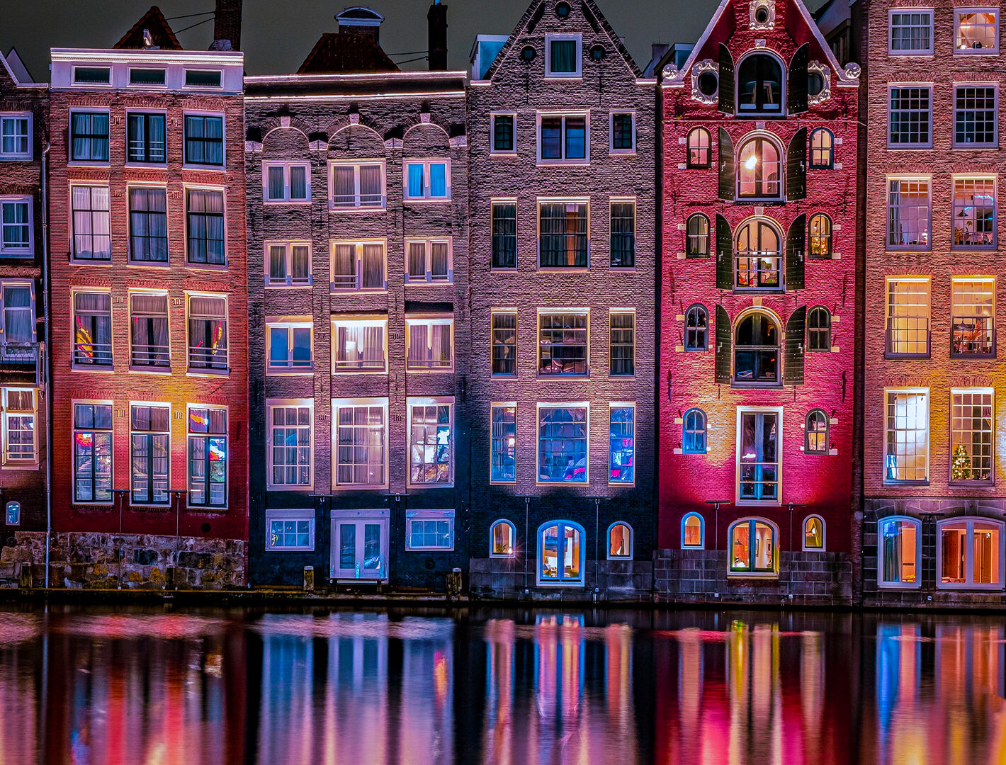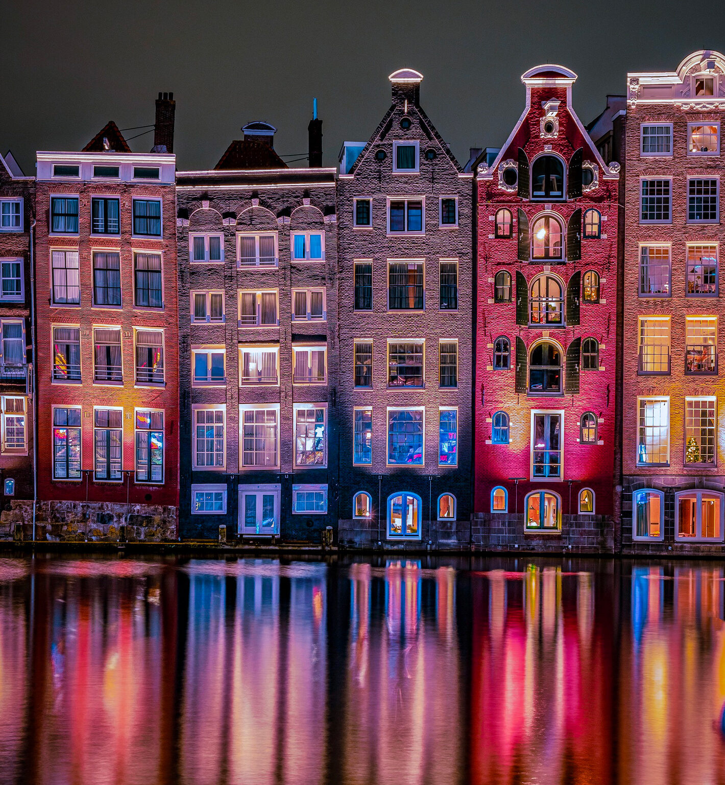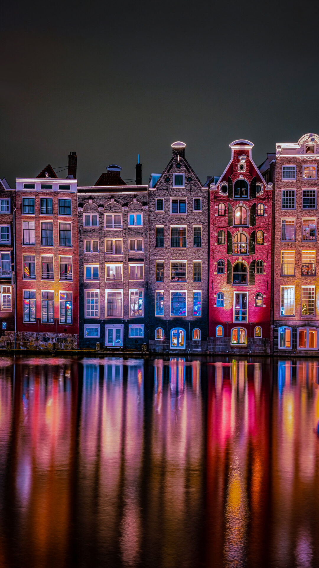 Illuminated townhouses line a dark canal, their facades closely arranged. Warm light from the windows creates vertical streaks of color refl…
