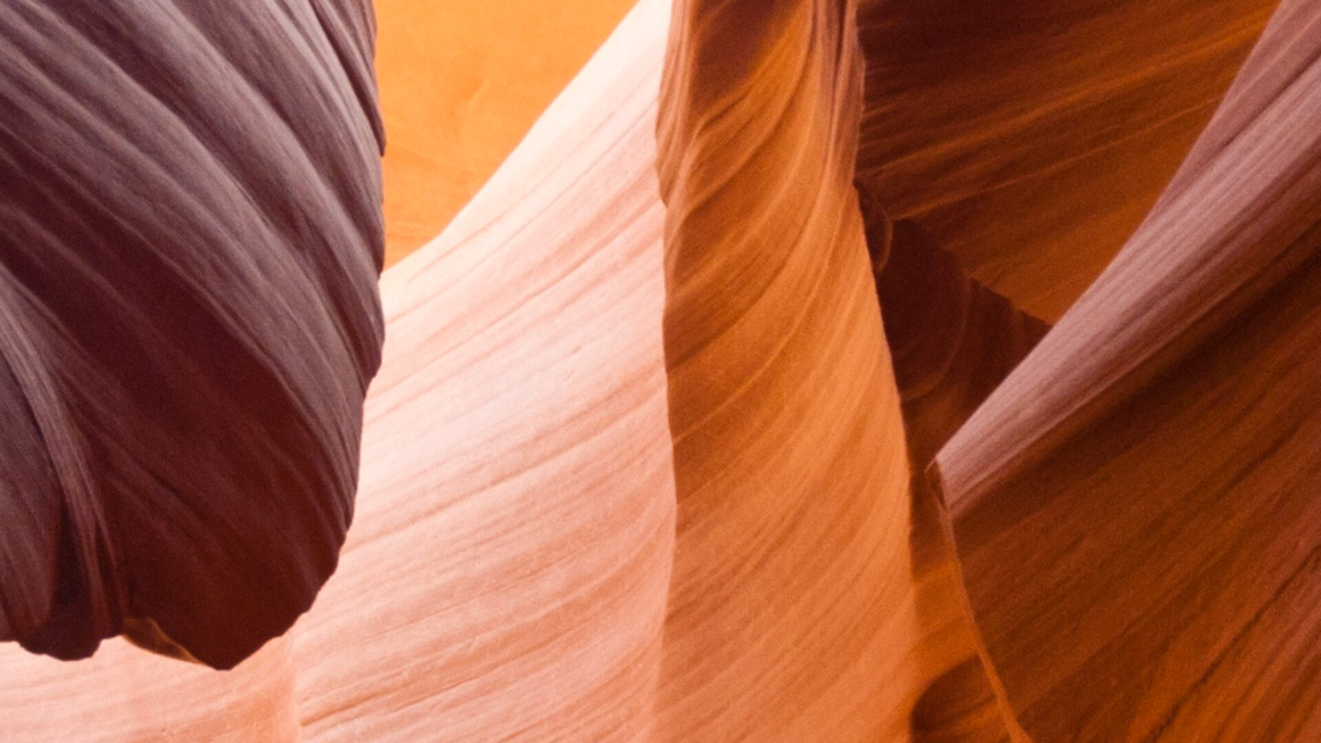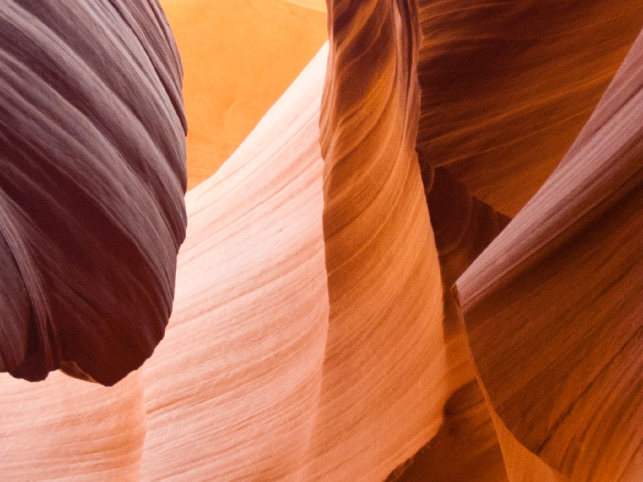 Smooth sandstone formations fill the frame, curving in tight, organic lines. Warm, golden light creates strong highlights and shadows across