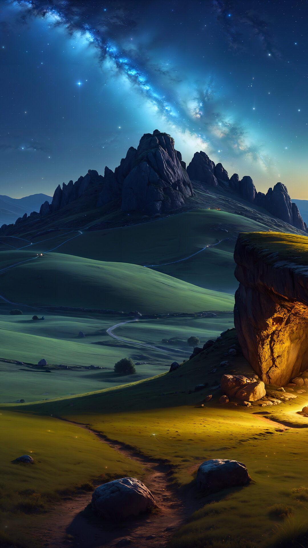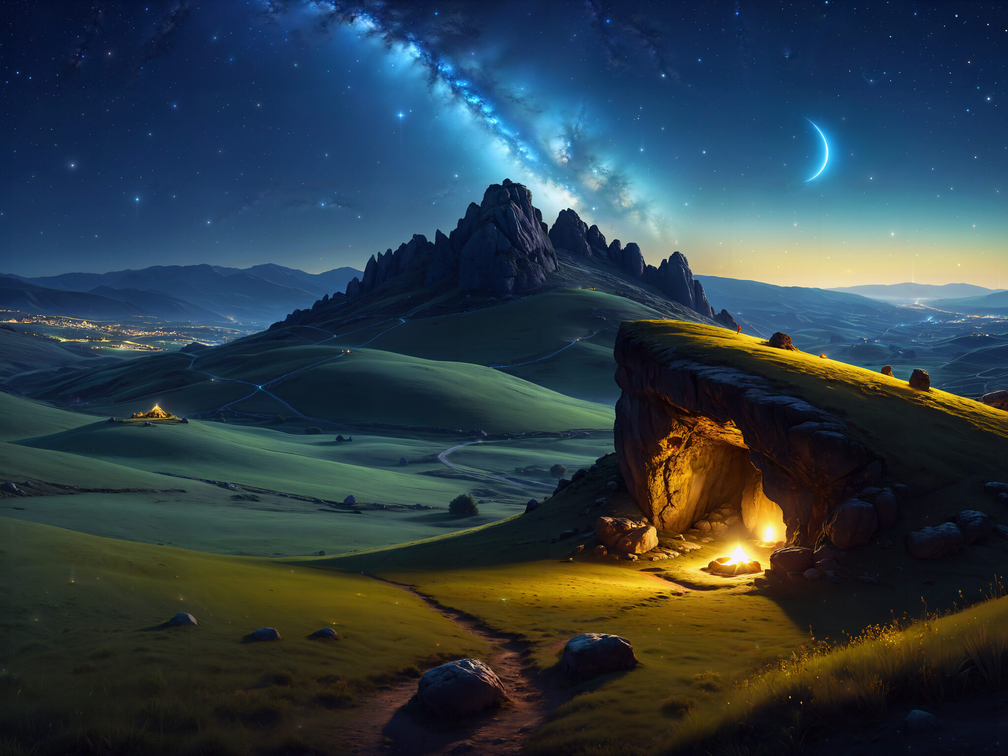 Rolling green hills lead to a dramatic rocky cave opening with warm golden light spilling out, while the deep blue night sky shows off the M…