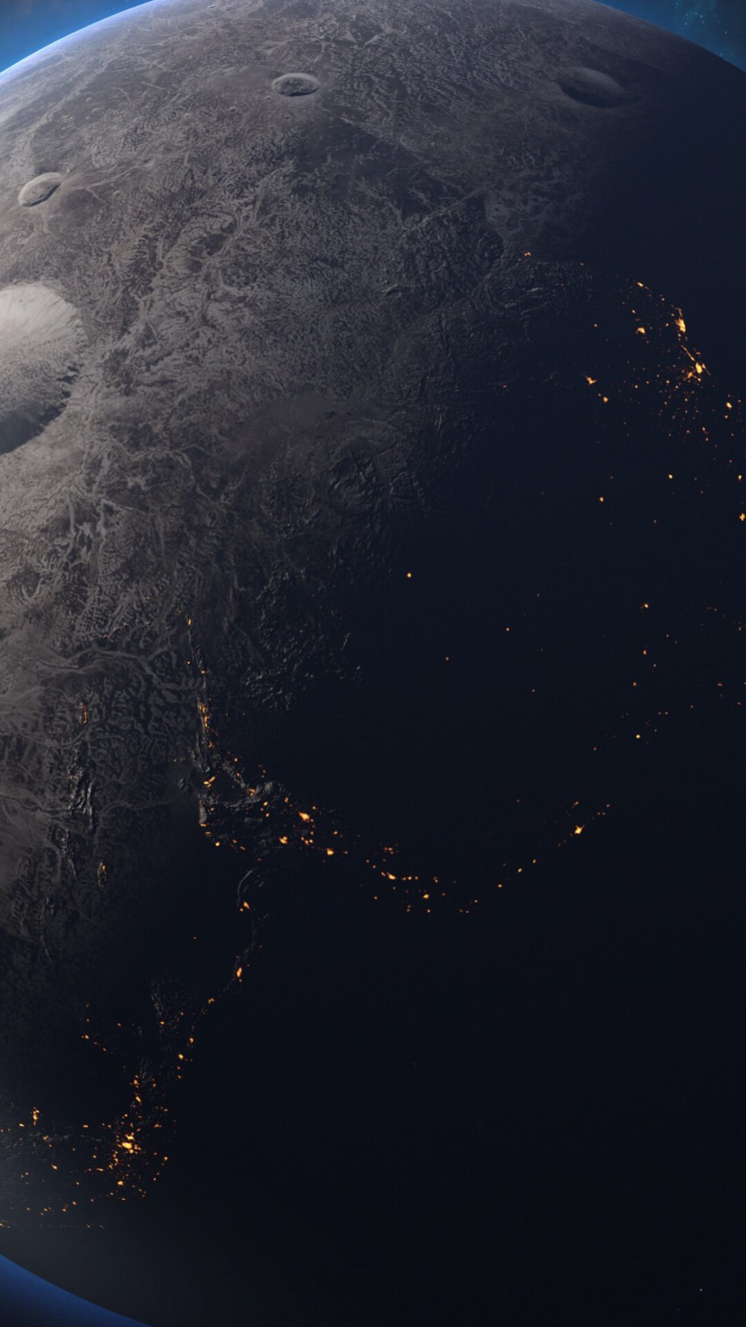 Ceres floats in deep space with its cratered gray surface illuminated by scattered orange lights against the star-filled darkness, while ano…