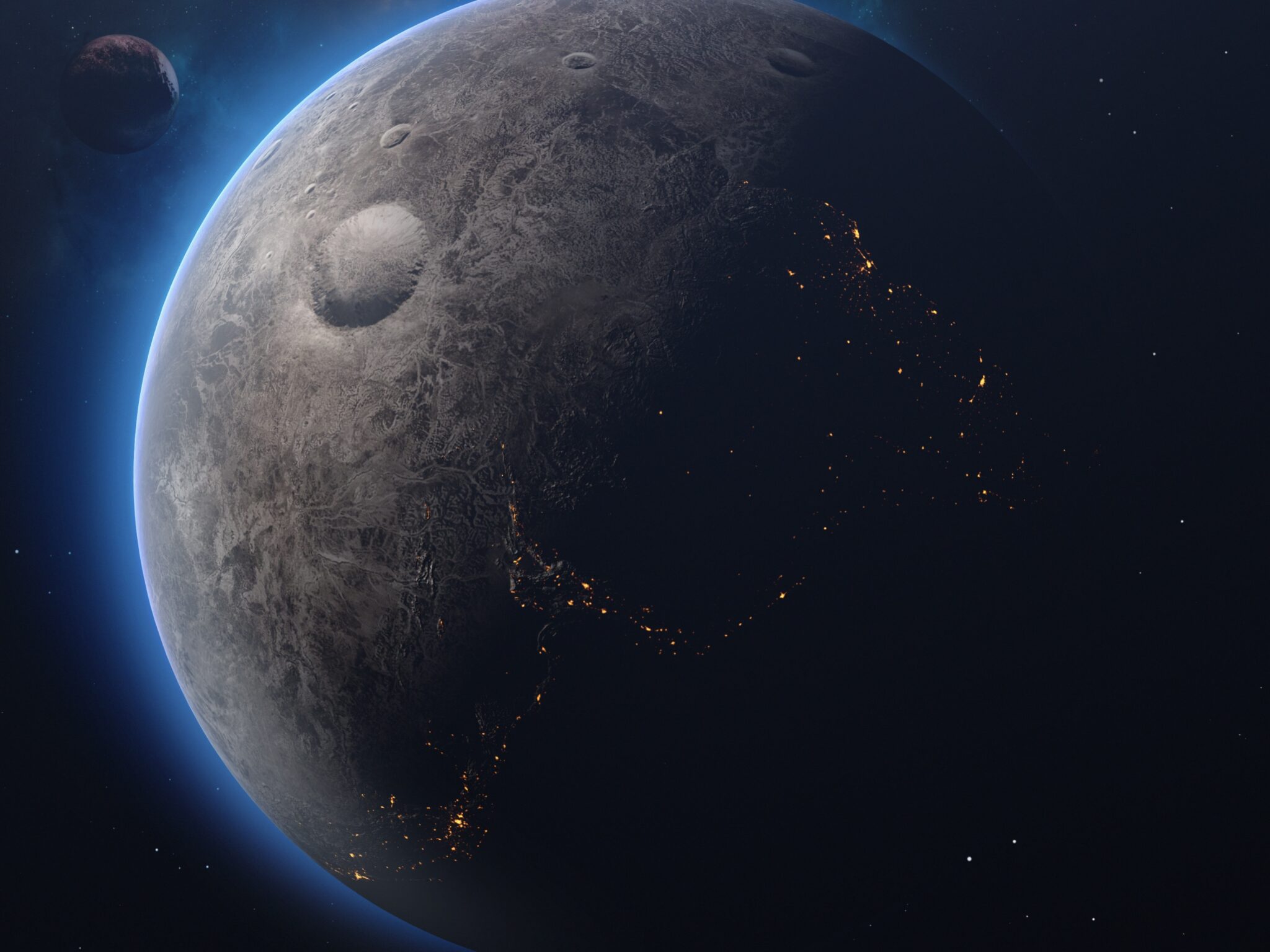 Ceres floats in deep space with its cratered gray surface illuminated by scattered orange lights against the star-filled darkness, while another celestial body lurks in the background. Made for 4K desktop displays that want some cosmic atmosphere.