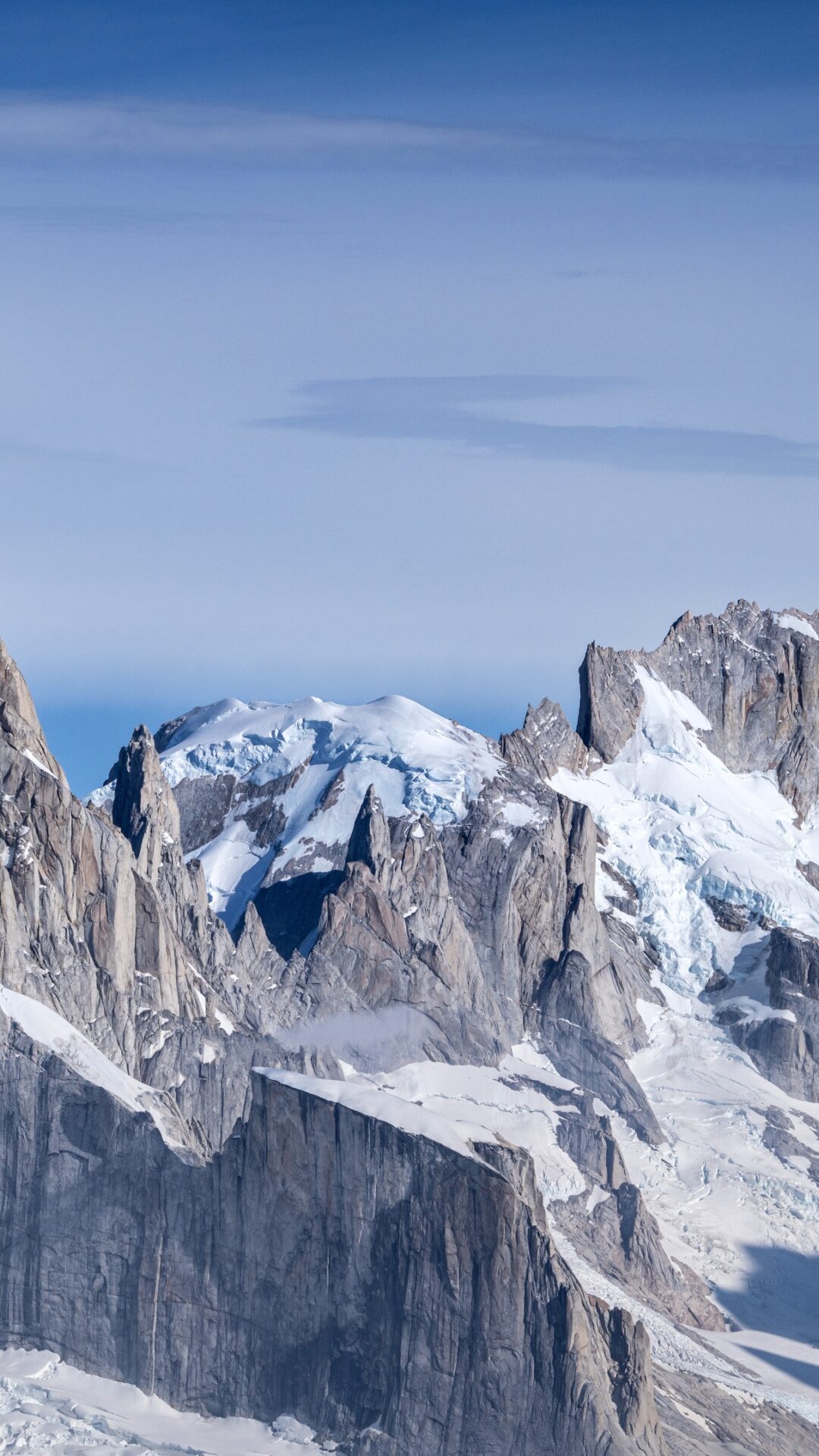 Cerro Torre's jagged granite spires rise dramatically against a soft blue sky, with fresh white snow clinging to the rocky faces and glacier