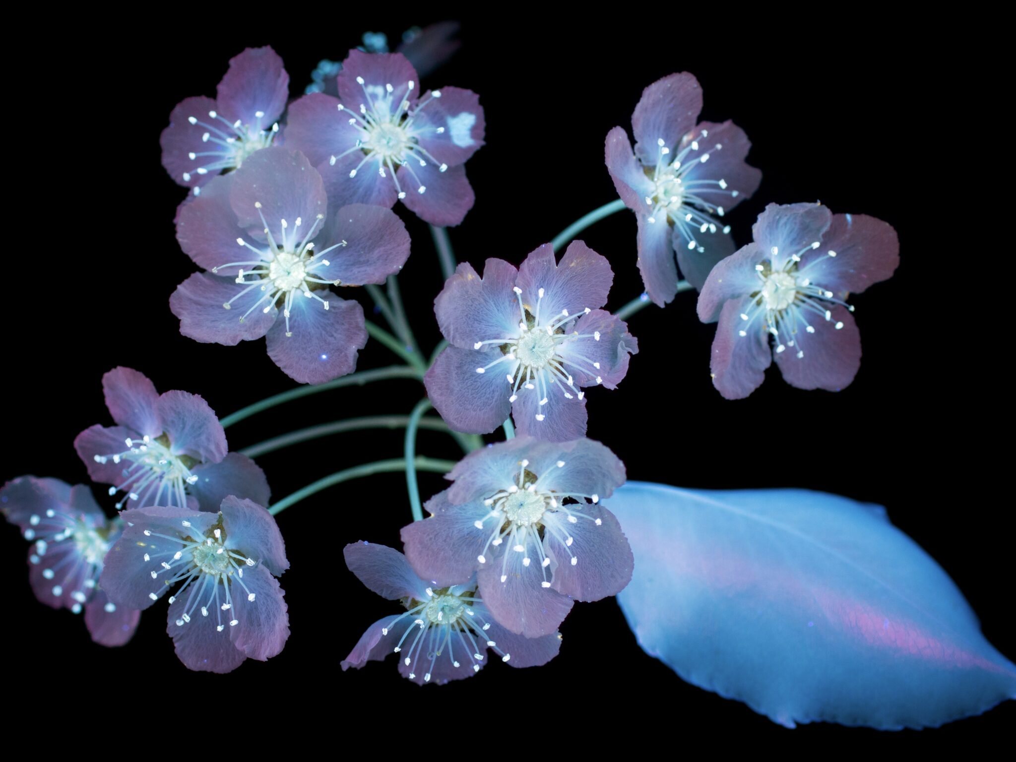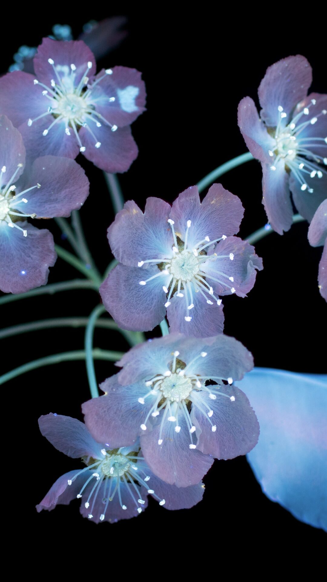 Pale blue cherry blossoms are arranged along curving stems against a solid black background. A single petal drifts downward with subtle grad