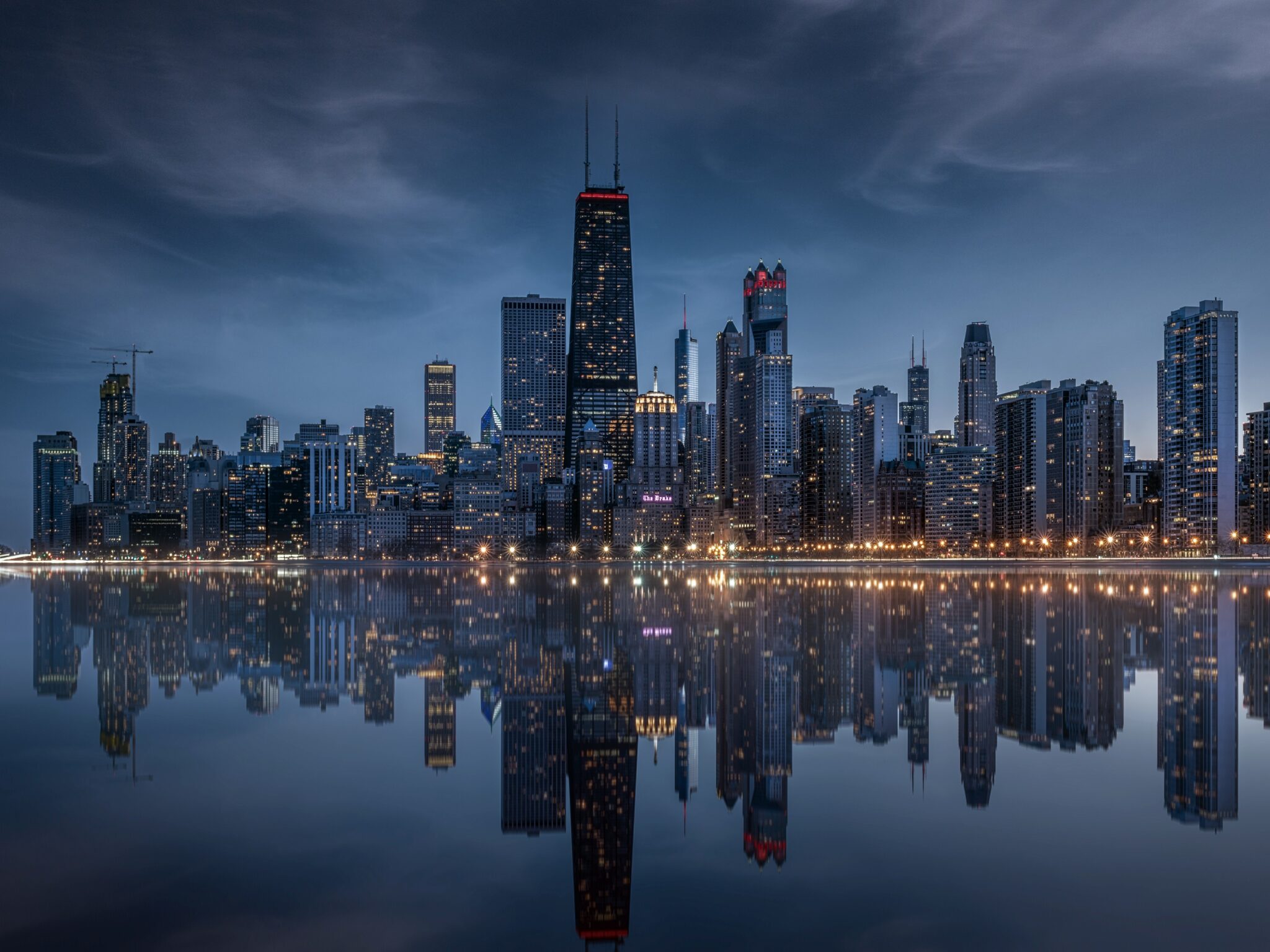 Chicago's skyline glows with warm golden and amber lights against a deep blue twilight sky, with the whole cityscape mirrored perfectly in still water below. For 4K monitors if you want that moody urban vibe on your desktop.