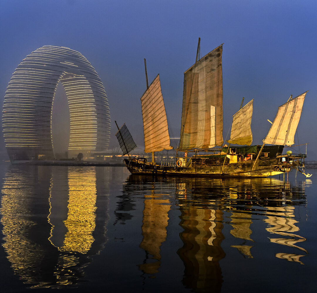 A dark-hulled Chinese junk with four angled sails drifts across glassy water in front of Huzhou's sweeping Sheraton tower. The mirror-calm s…