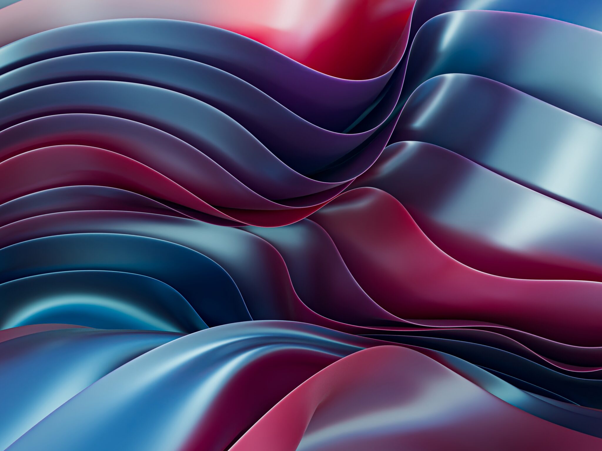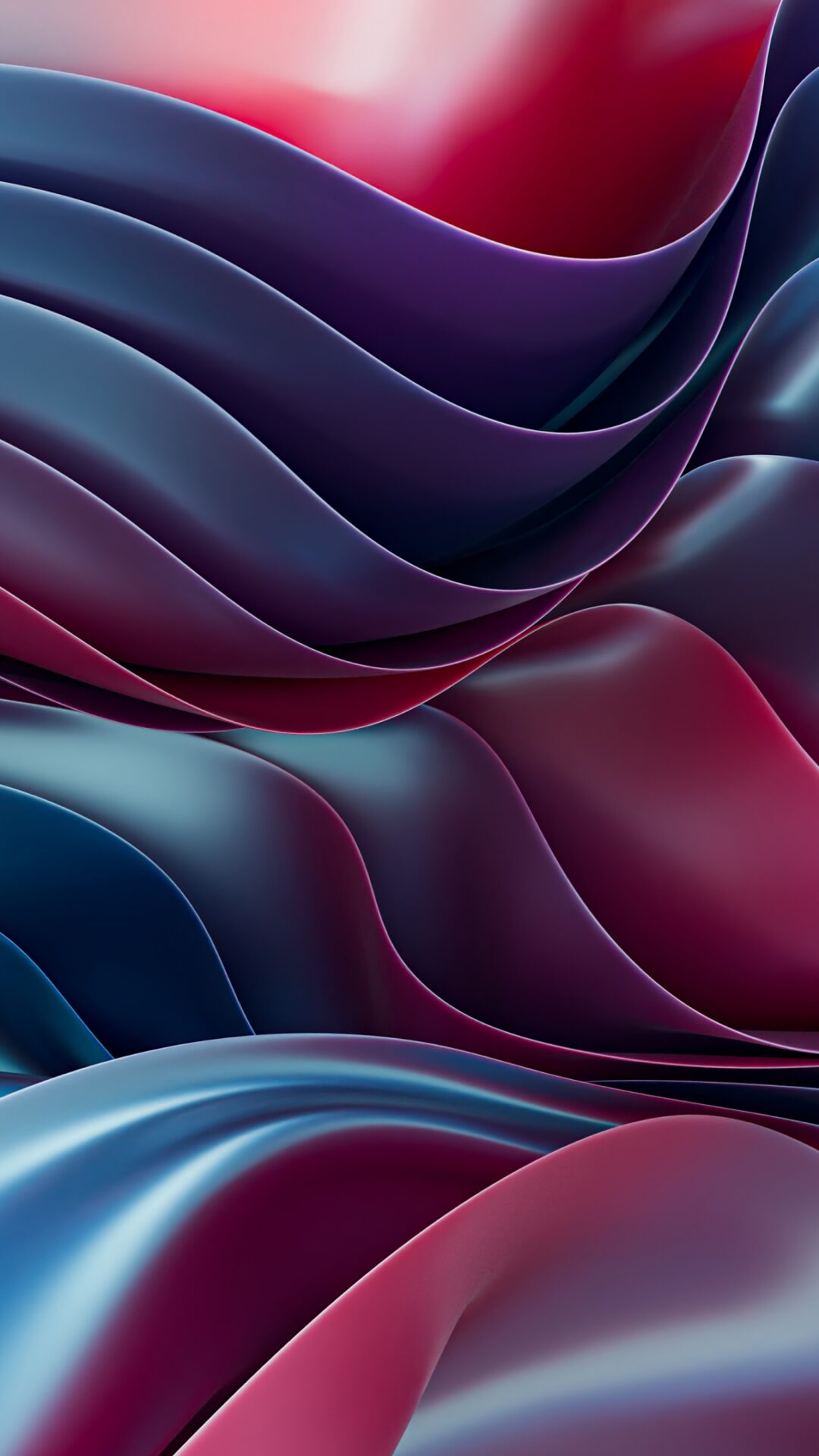 Smooth metallic ribbons flow and intertwine with soft gradients of dusty blue, deep teal, and rich burgundy creating a silky 3D abstract eff