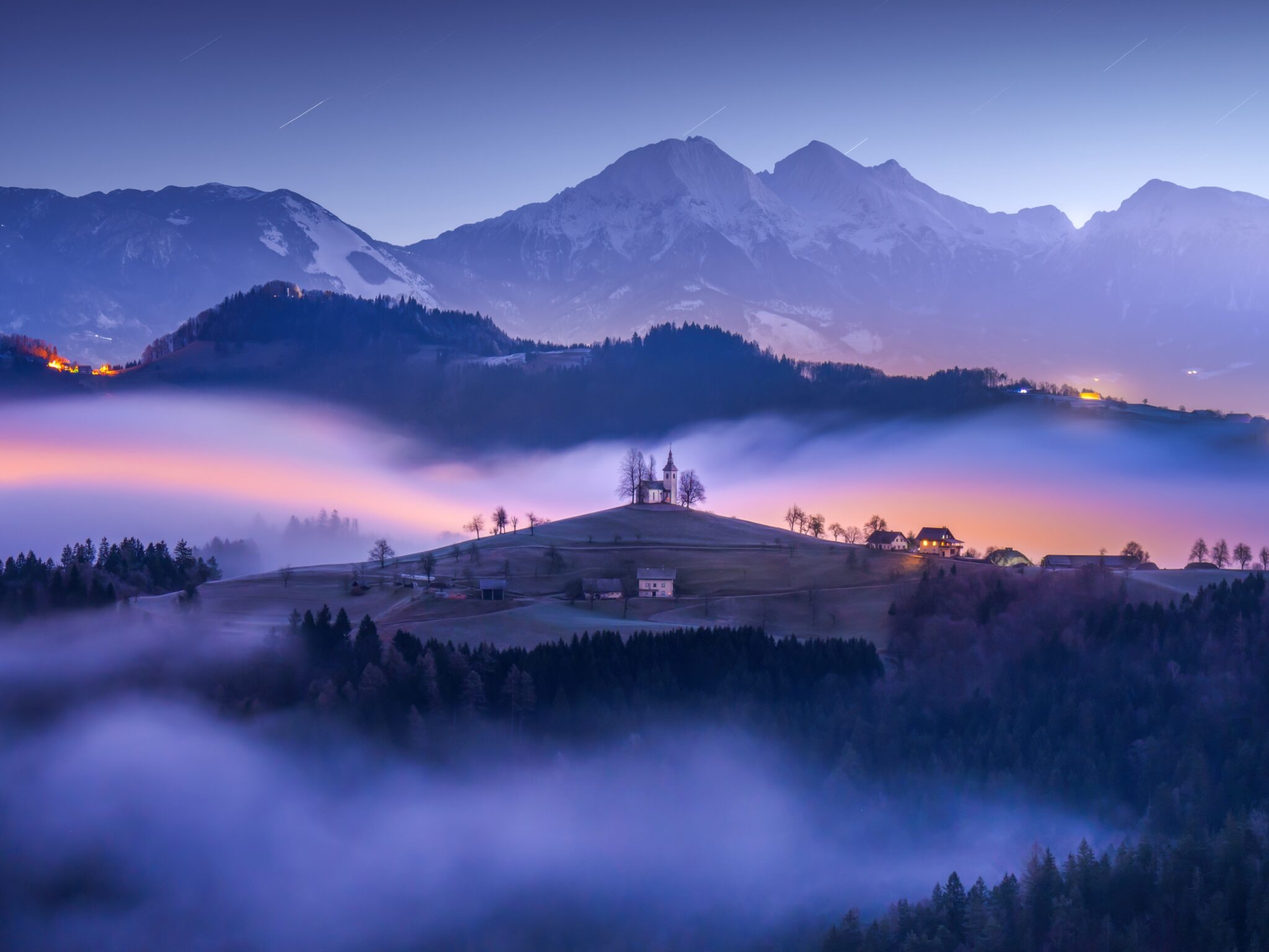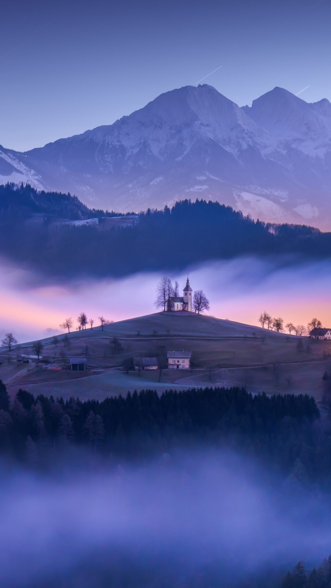 A small church sits atop a grassy hill, surrounded by low-lying fog and dark forested slopes. Soft pink and purple tones illuminate the scene, contrasting with the cool blue of the distant mountain range.