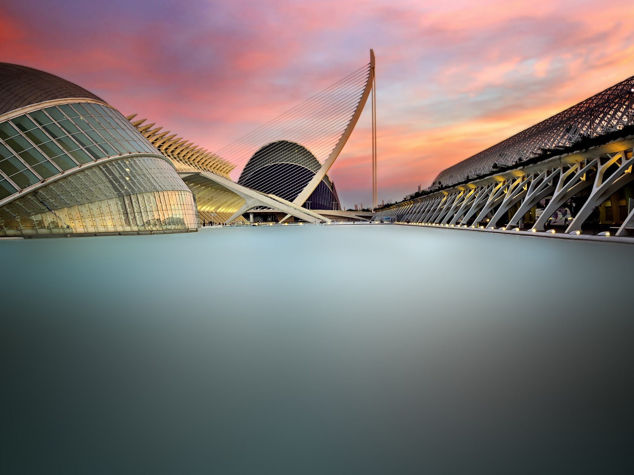 Modern architecture reflects across a wide body of water at dusk. Soft pink and purple hues in the sky create a calm and expansive atmosphere.