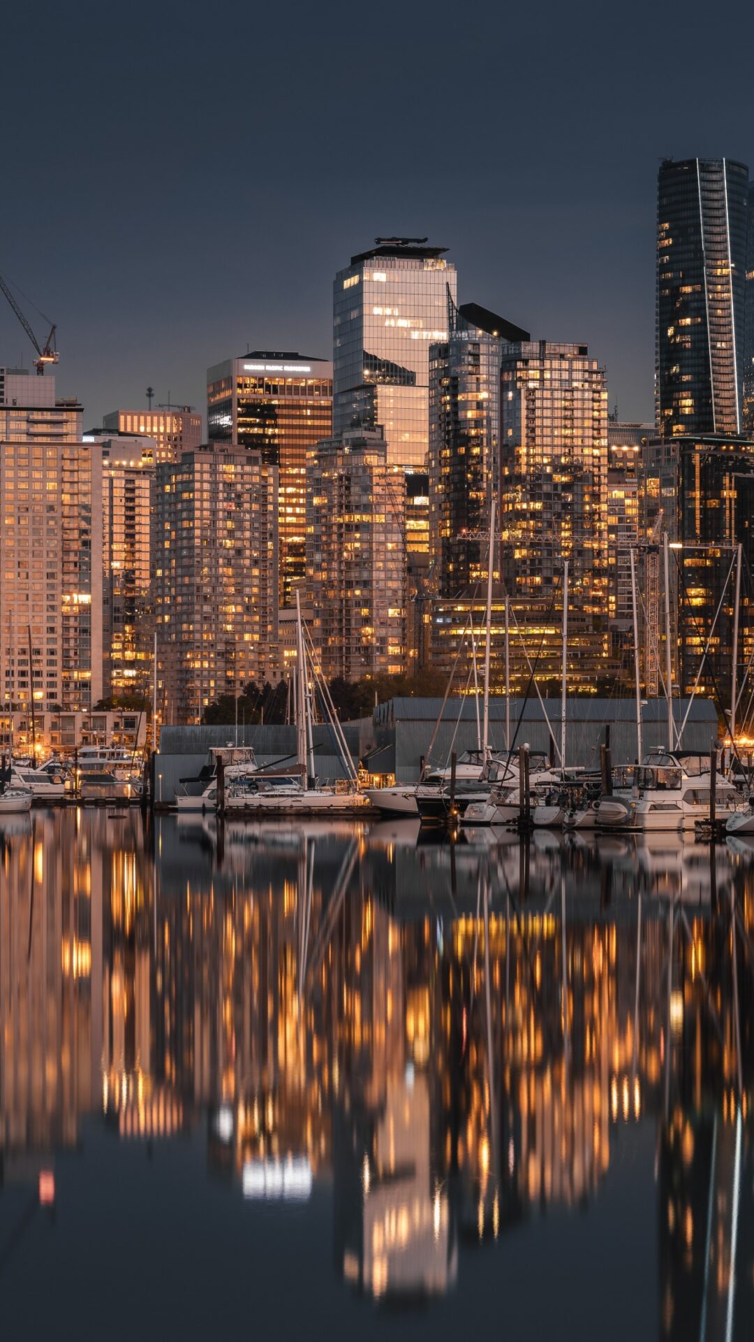 A city skyline is viewed across dark water, filled with sailboats and illuminated buildings. The warm, golden lights of the city and boats a…