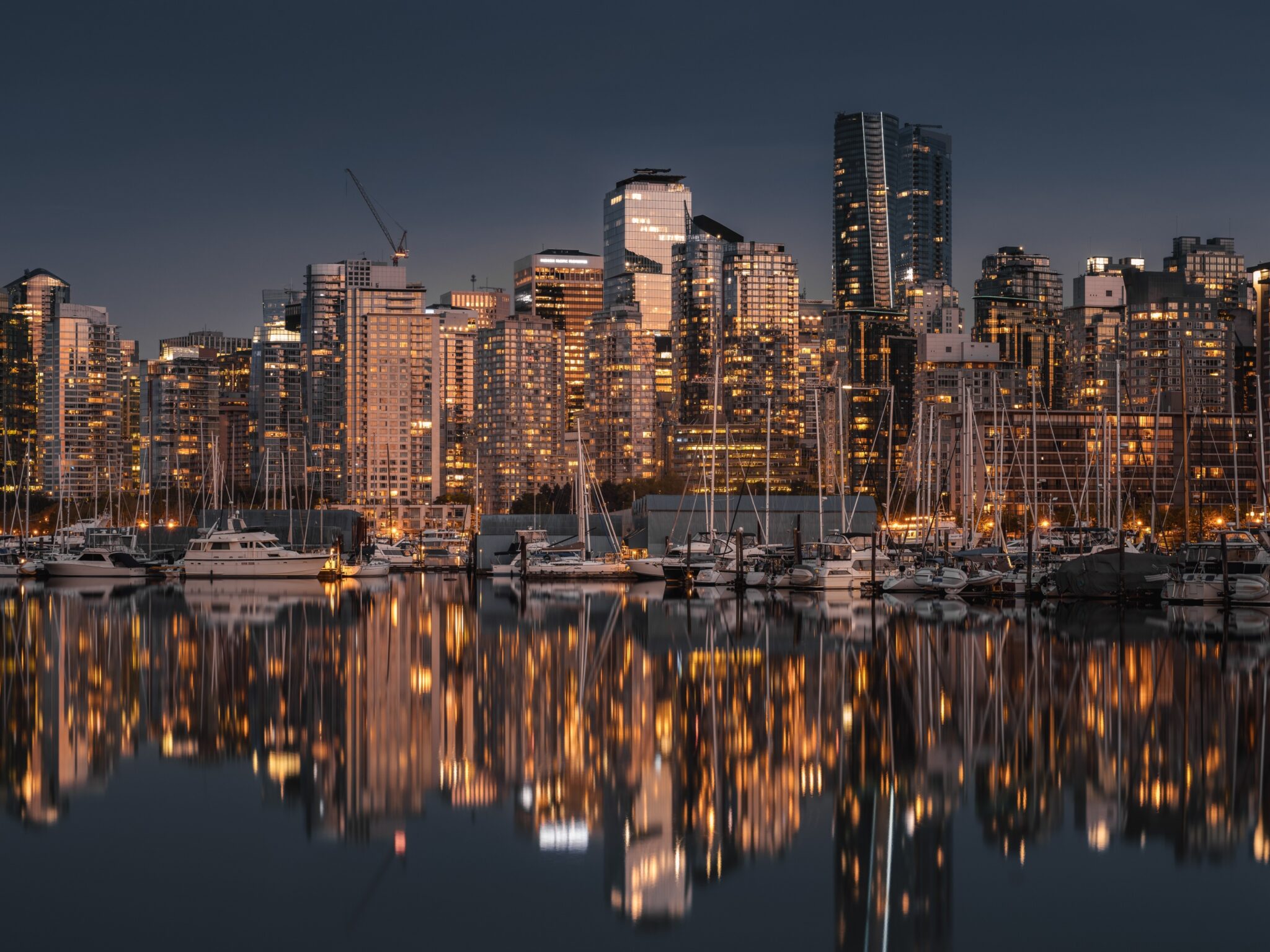 A city skyline is viewed across dark water, filled with sailboats and illuminated buildings. The warm, golden lights of the city and boats are reflected in the calm water, creating a sense of depth.