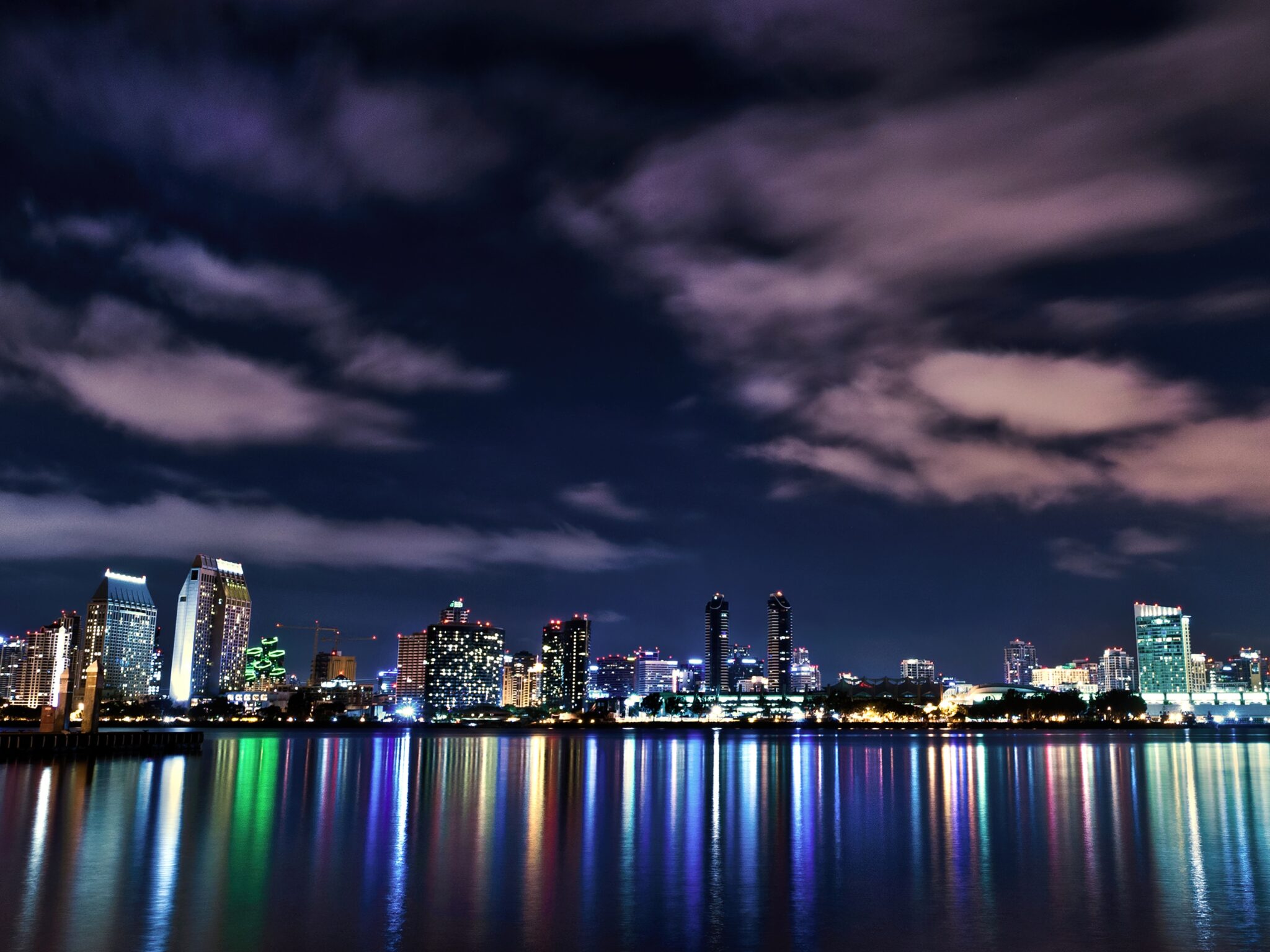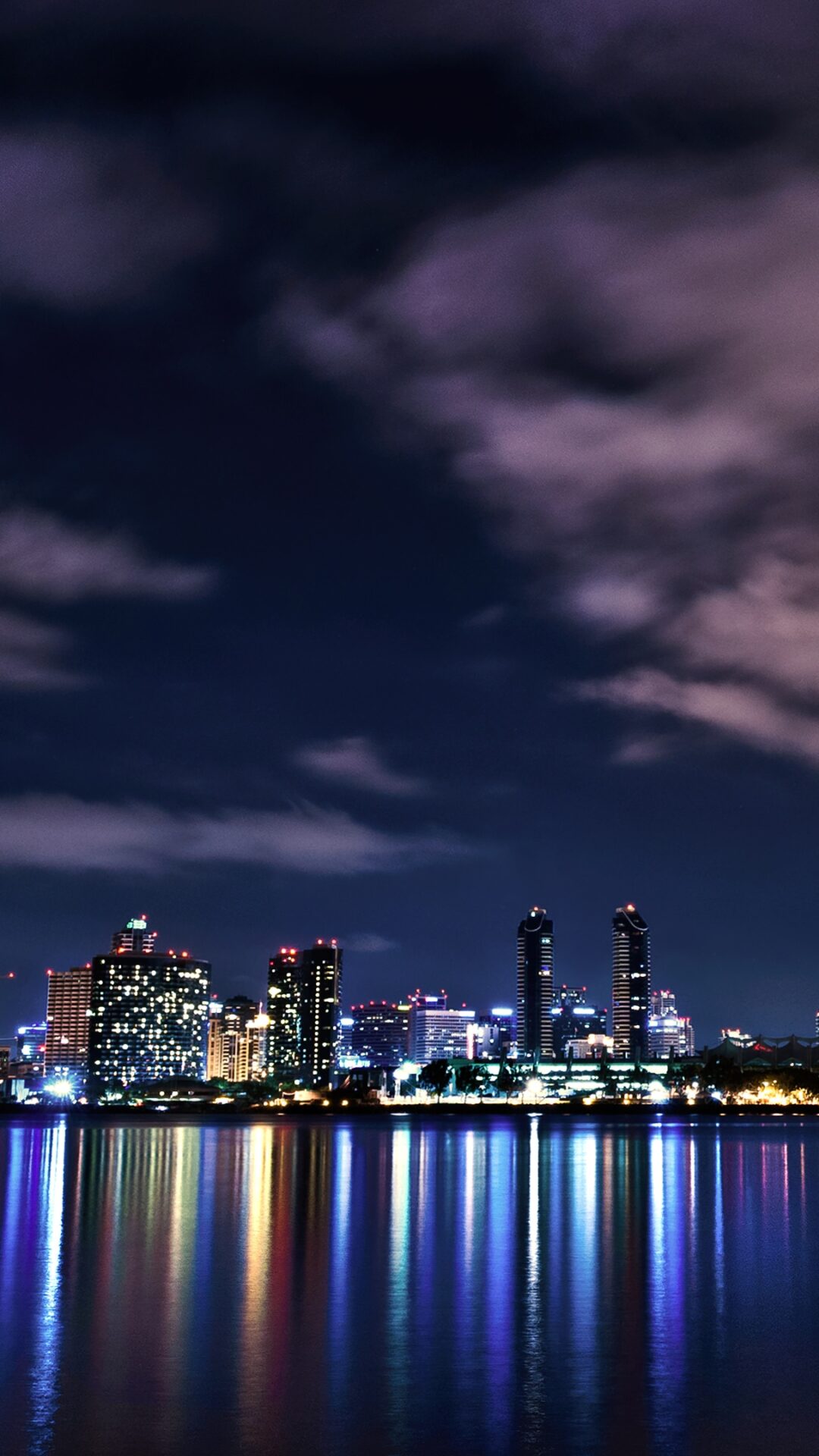 A city skyline is reflected in dark water under a cloudy night sky. The water's surface displays vertical streaks of color from the city lig…