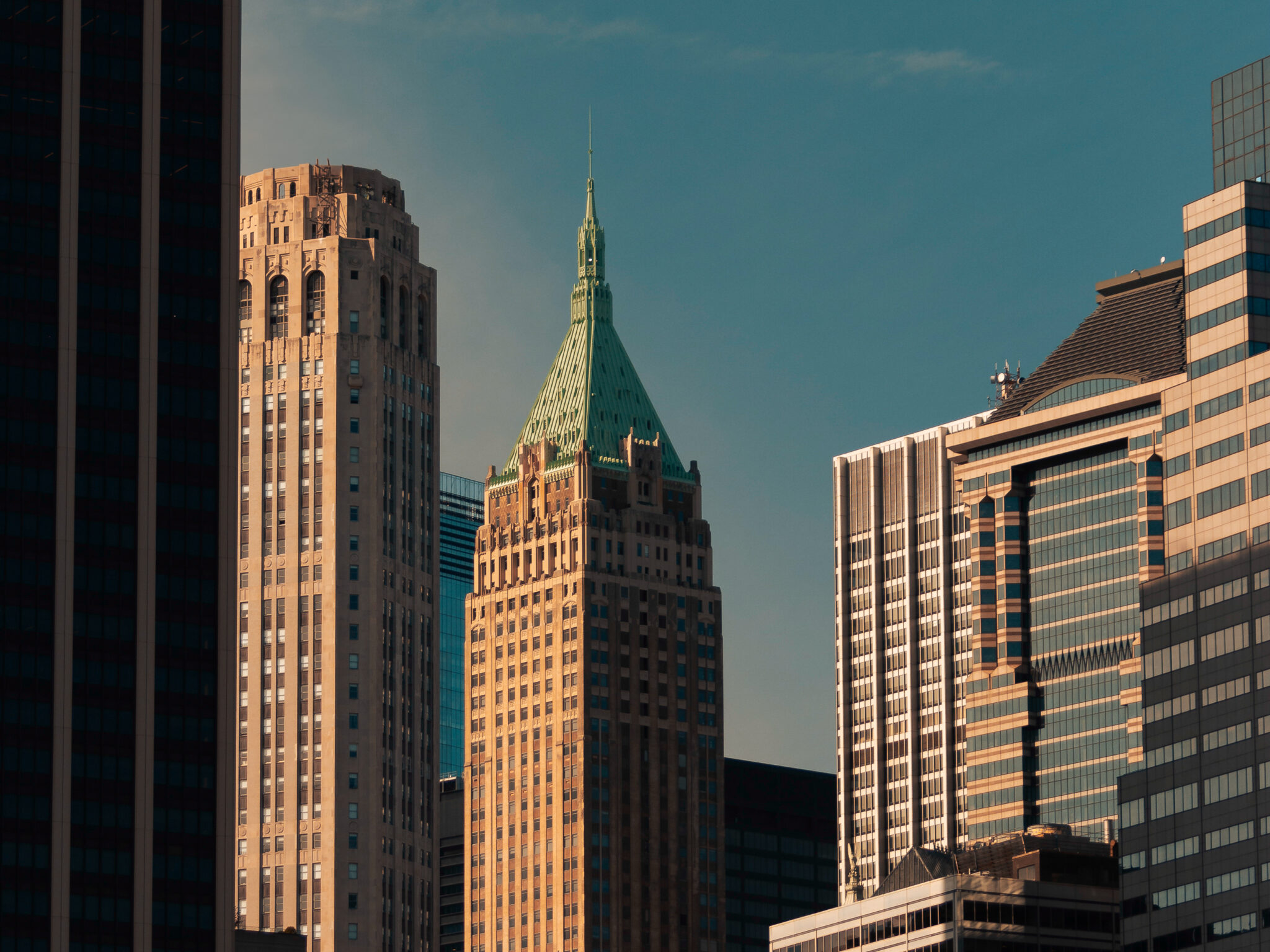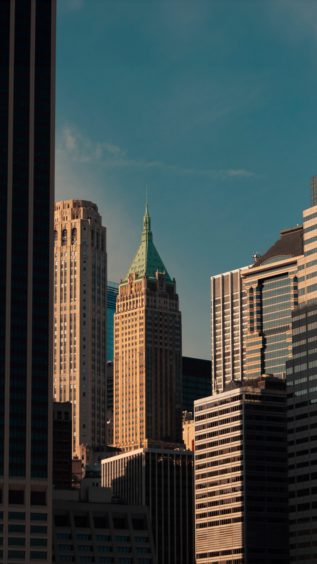 Multiple tall buildings fill the frame, creating a dense urban skyline. Warm, diffused light highlights the textured surfaces and subtle green color of a central spire.