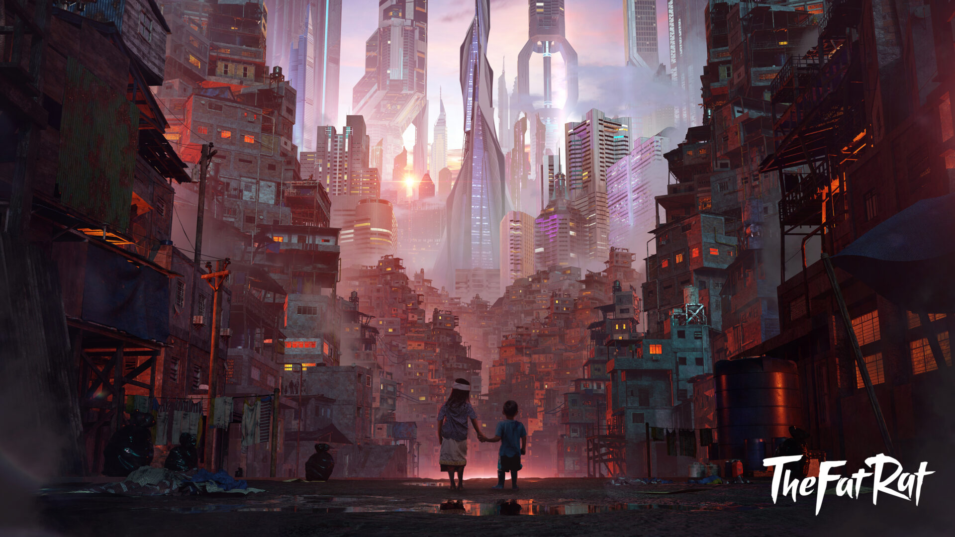 A street scene shows two children walking away from the viewer towards a distant cityscape. Painted textures and a warm color palette create depth and a hazy atmospheric perspective.