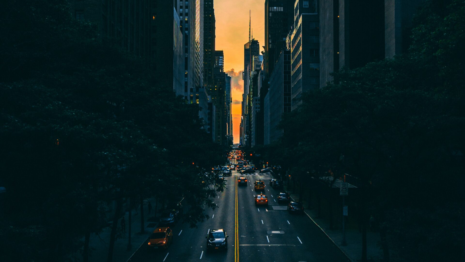 A straight city street runs toward a distant skyline, framed by tall buildings. Warm orange light from the setting sun contrasts with the da…