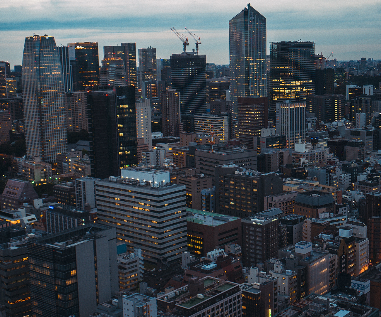 A dense urban skyline fills the frame, viewed from a high angle at dusk. Warm yellow lights from the buildings contrast with the cool blue tones of the cloudy sky.