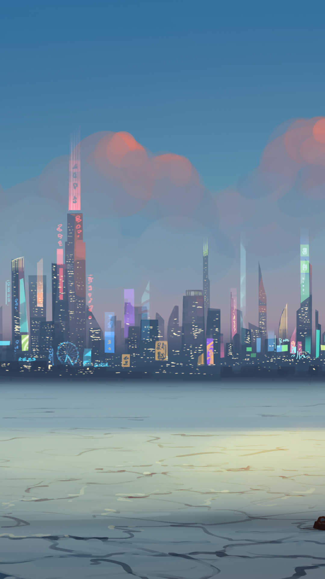 A woman sits on a blue vehicle facing a distant futuristic cityscape. Warm orange and pink hues blend with cool blues in the cloudy sky, cre
