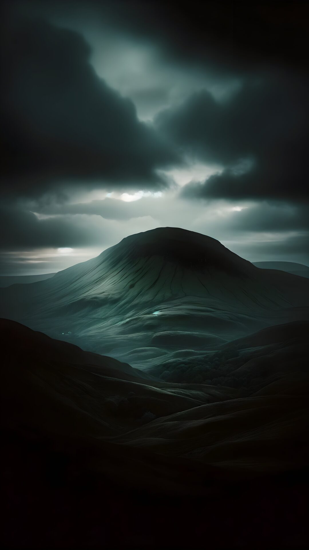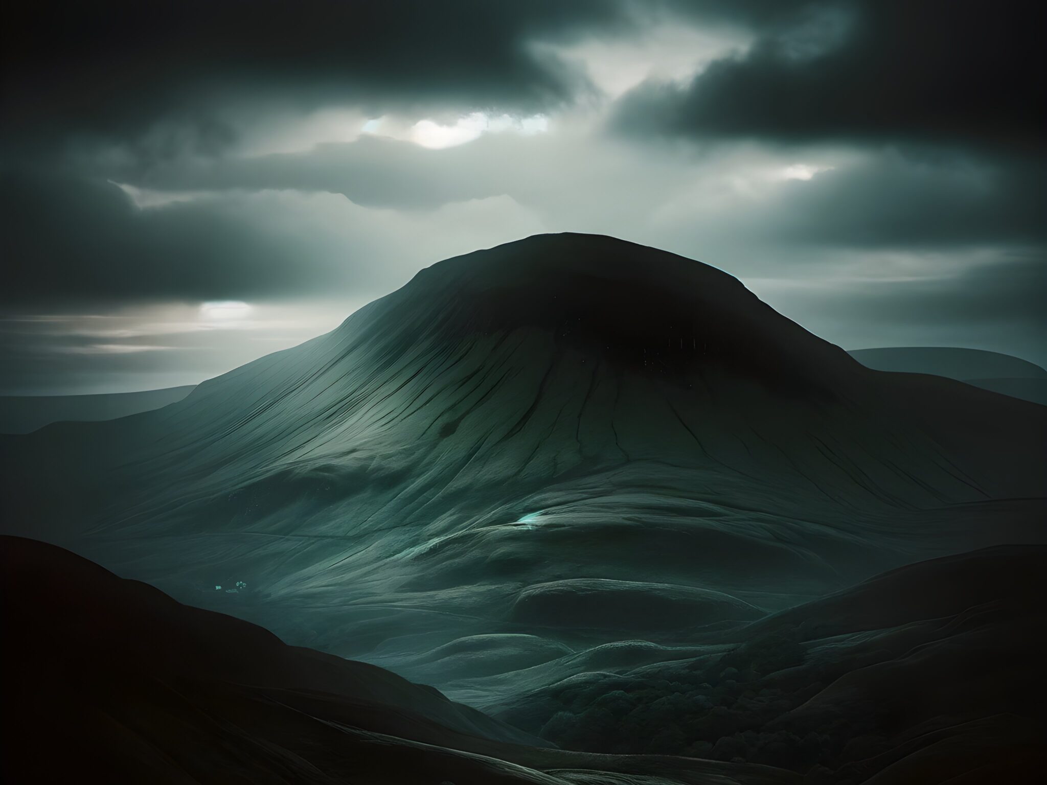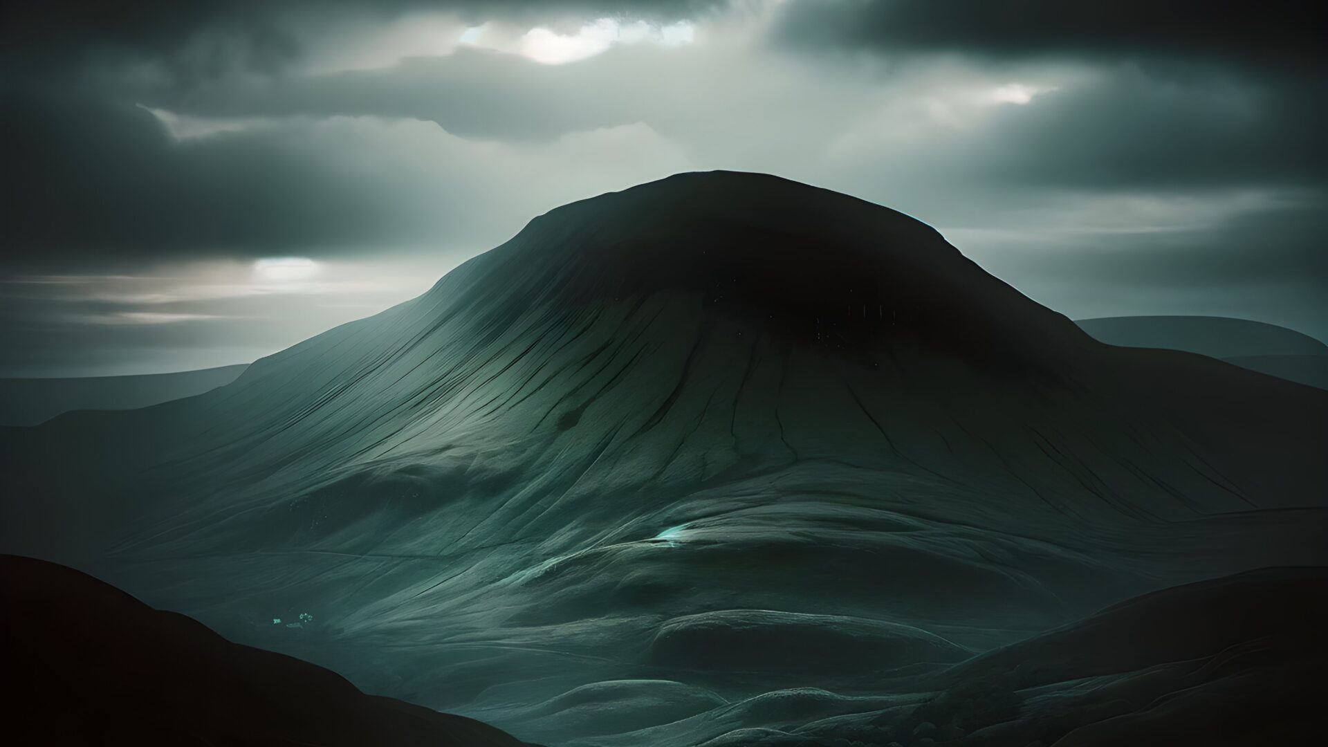 A solitary mountain dominates the frame, set against a dramatic, clouded sky. The dark greens and grays are offset by subtle light breaking …