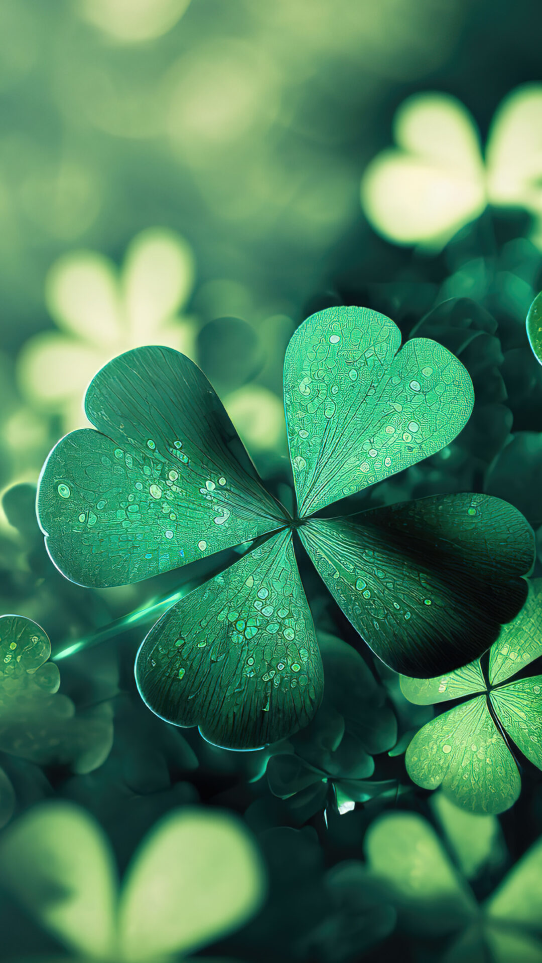 A dense collection of green clover fills the frame, with shallow depth of field. Subtle droplets highlight the smooth texture of the leaves …