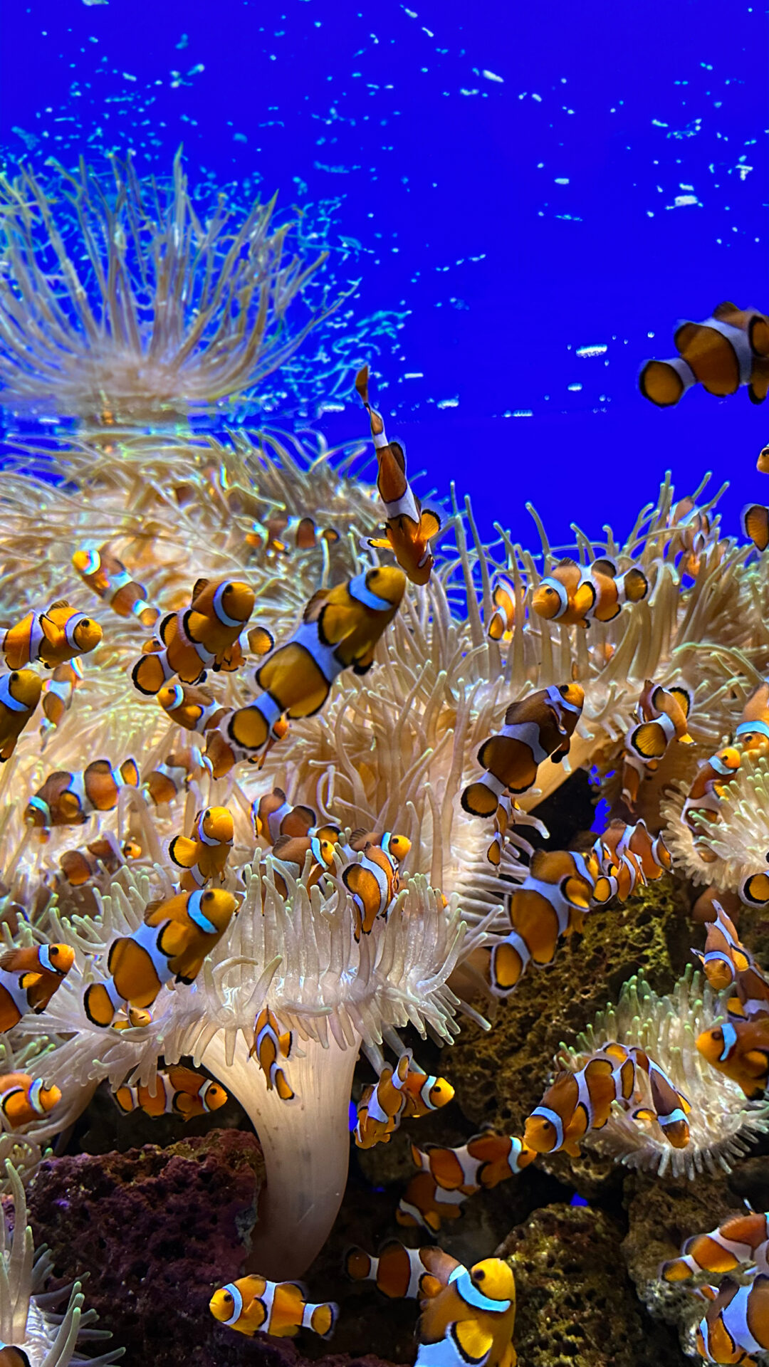 Numerous clownfish swim within a large sea anemone, filling the frame with orange and white patterns. The deep blue water creates a stark co…